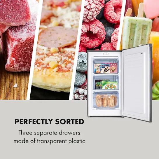 S úžitkovým vnútorným priestorom 60 litrov ponúka mrazniča veľa miesta pre malé a veľké potraviny, hlboké zmrazovanie sa dá nastaviť bezstupňovým otočným ovládačom. Pomocou troch oddelených zásuviek s priehľadnou prednou časťou môžete hlboko zmrazené potraviny rozložiť a hygienicky úsporne uskladňiť. Vďaka energetickej triede E je počas prevádzky obzvlášť úsporná a efektívna.