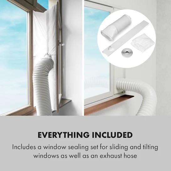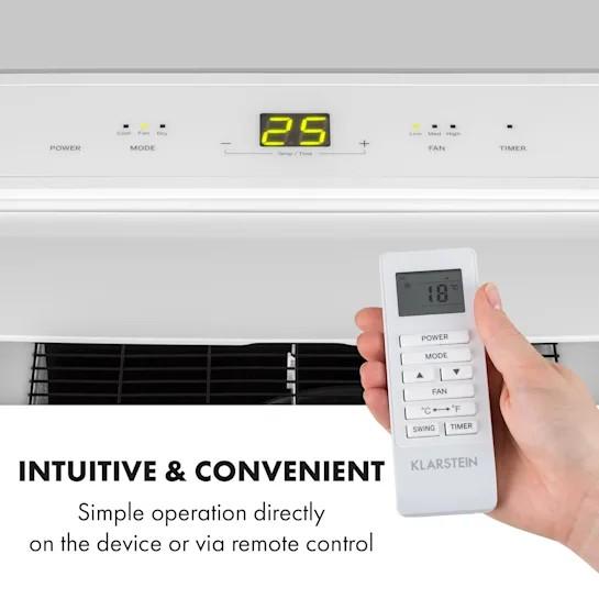 Ovládanie všestranného chladiaceho zariadenia prebieha manuálne prostredníctvom prehľadnej ovládacej plochy alebo pohodlne z diaľky pomocou dodávaného diaľkového ovládača. Prepínateľná oscilácia ventilačného otvoru alebo až 24-hodinový programovateľný časovač zapnutia/vypnutia dopĺňajú klimatizáciu Iceblock o ďalšie užitočné funkcie. Pre rýchlu inštaláciu sa dodáva klimatizačné zariadenie Klarstein Iceblock s tesniacou sadou pre sklápacie aj posuvné okná. Vzduchová hadica, ktorá sa dá vytiahnuť až do 1,5 m, a kolieska s hladkým chodom uľahčujú výber umiestnenia aj premiestnenie klimatizácie.