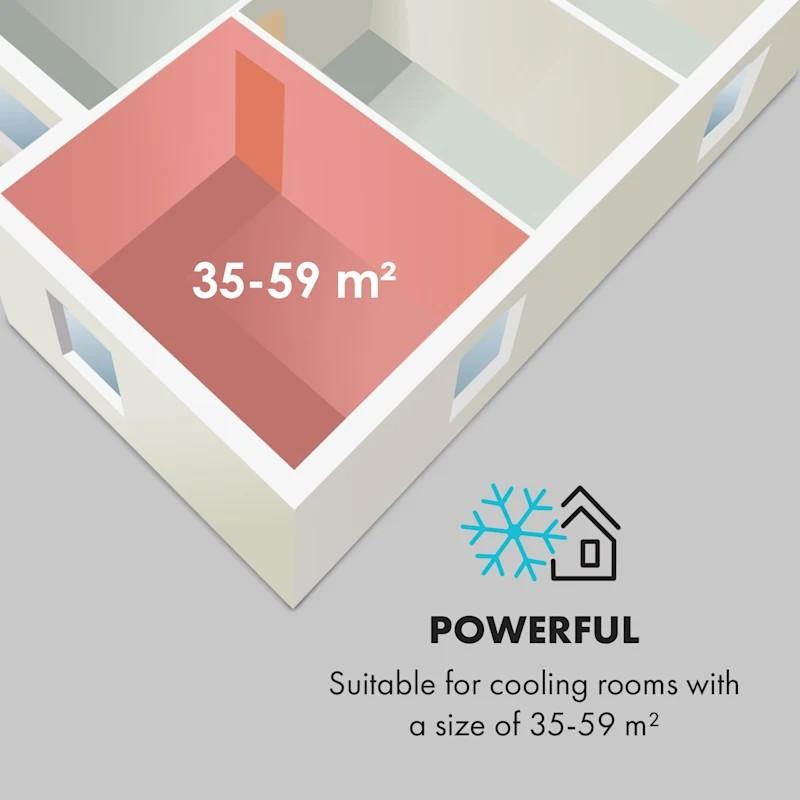 - Mobilná klimatizácia s výkonom 12 000 BTU/3,5 kW pre miestnosti 35-59 m² a energetickou triedou A