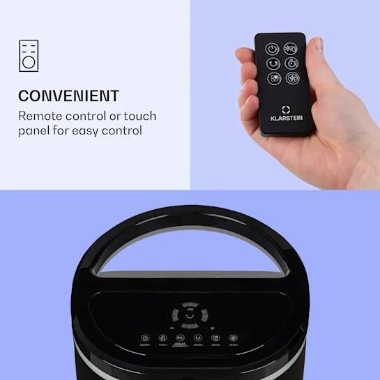 - Ovládanie prostredníctvom dotykového ovládacieho panela, diaľkového ovládania alebo aplikácie Klarstein