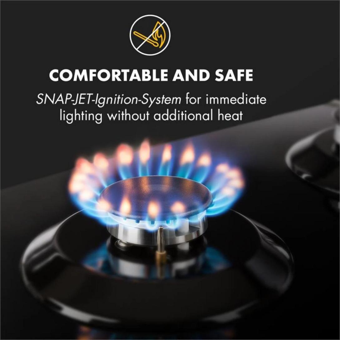 Na priestrannej varnej doske sa nachádzajú štyri kvalitné Sabaf horáky, ktoré hrejú s výkonom 3,6 kW, 1 kW a dvakrát po 1,75 kW. Ovládanie je pritom absolútne intuitívne vďaka zrozumiteľným symbolom na veľkých otočných gombíkoch, prívod tepla sa dá počas procesu varenia vždy prispôsobiť. Dodatočný oheň na zapálenie nie je potrebný: plynový plameň sa jednoducho zapáli pomocou systému zapaľovania SnapJetIgnition. Horáky distribuujú teplo rovnomerne v strede a na okrajoch hrncov alebo panvíc, všetko je perfektne a optimálne uvarené. Obidve odnímateľné liatinové mriežky z masívnej liatiny sú vhodné pre takmer všetky typy kuchynského riadu, na plameni sú umiestnené presne a bez rizika prevrátenia hrncov.