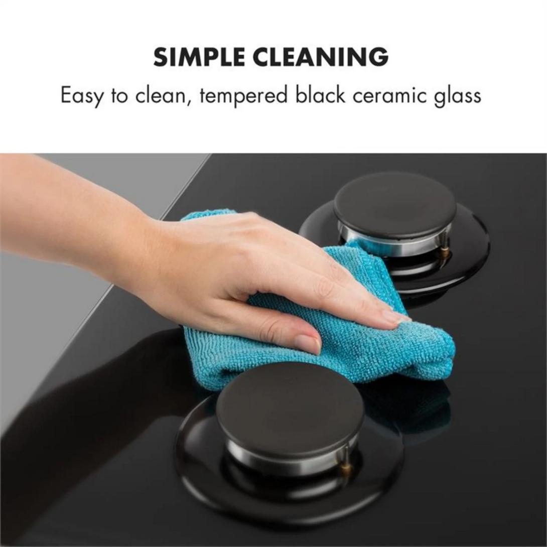 Po varení je možné v prípade potreby plynovú varnú dosku jednoducho očistiť: kvôli tomu má povrch z ľahko umývateľného, tvrdeného keramického skla čiernej farby. Nielen že vyzerá neuveriteľne dobre, úžasne ľahko sa tiež čistí.