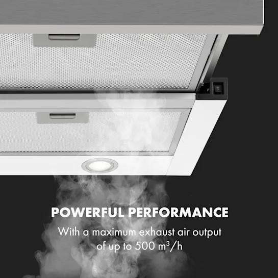 Digestor, Silný výkon: s maximálnym odsávacím výkonom do 500 m3/h, príkon: 150 W, LED svetlá, dĺžka sieťového kábla: 1,0 m