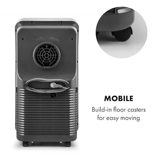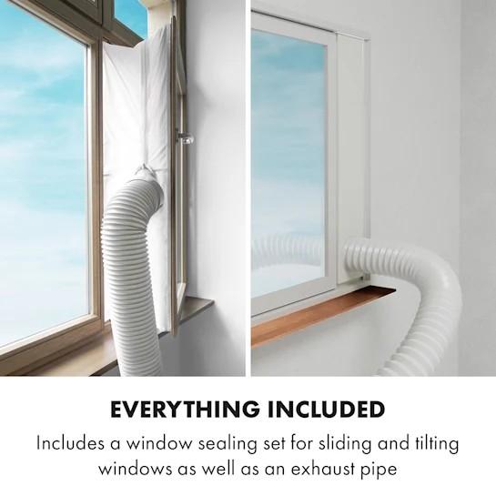 Inštalácia 3 v 1 klimatizácie je veľmi jednoduchá: pripojte dodanú odpadovú hadicu k zariadeniu a vyveďte ju z okna. Súčasťou balenia je tesniaca sada pre posuvné aj vyklápacie okná, aby sa zabránilo vniknutiu nového teplého vzduchu do miestnosti. Vďaka pevne namontovaným kolieskam sa dá klimatizácia ľahko presúvať, je teda priestorovo veľmi variabilne umiestniteľná.