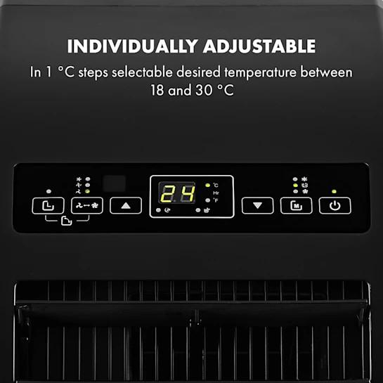 Viac výkonu pre vysnívanú klímu: S chladiacim výkonom 3,0 kW generuje klimatizácia Klarstein Metrobreeze Rom príjemné požadované teploty od 18 do 30 °C. Výkon pritom nemusí byť drahý: 3-stupňovo nastaviteľný ventilátor rozdeľuje ochladený vzduch v miestnosti ako jemný vánok alebo silný vietor a postará sa o prívod čerstvého vzduchu pre ďalšiu úľavu. Kto chce stimulovať len prúdenie vzduchu, môže nechať pracovať iba samostatný ventilátor a šetrí na spotrebe elektrickej energie. Programovateľný časovač zapne alebo vypne klimatizáciu po uplynutí nastaveného času, počas režimu spánku sa pomaly znižuje do režimu chladenia. Všetky funkcie klimatizácie Klarstein Metrobreeze Rom možno nastaviť na dotykovom paneli zariadenia alebo pohodlne pomocou diaľkového ovládača.