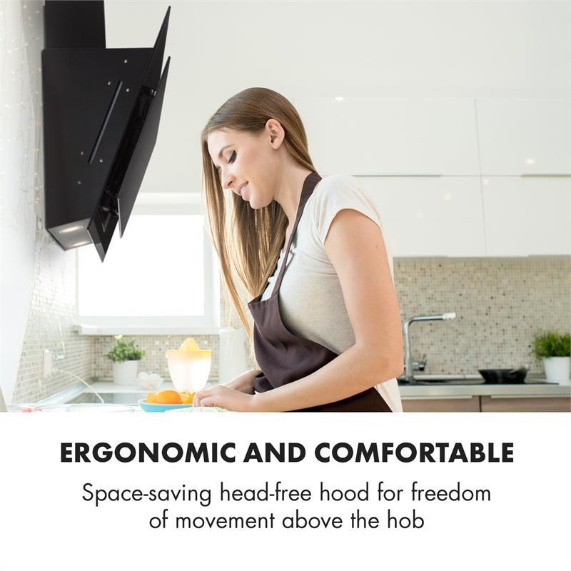 - Ergonomický a pohodlný: priestorovo úsporný digestor s voľným priestorom na hlavu pre voľnosť pohybu nad varnou plochou