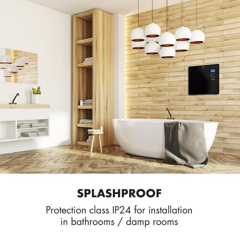 Všetky nastavenia možno realizovať priamo na dotykovom paneli zariadenia. Integrovaný LCD displej prehľadne poskytuje informácie o vybraných funkciách a zobrazuje teplotu v miestnosti. Elegantný čierny predný panel vyrobený z 5 mm hrubého skla dodá každej miestnosti luxusný nádych.