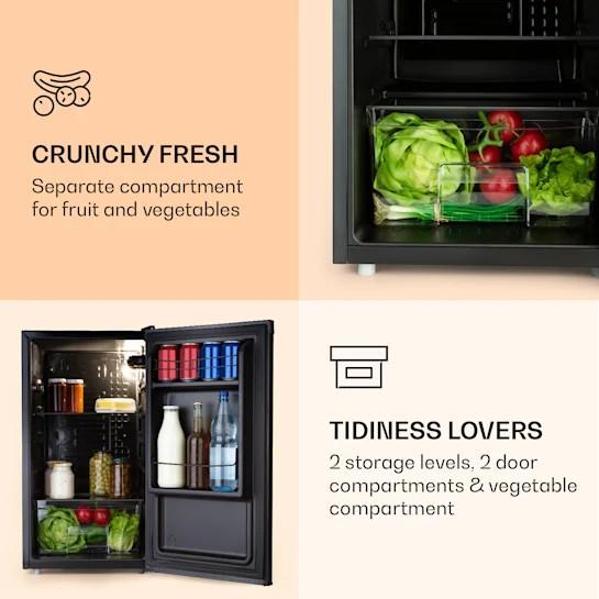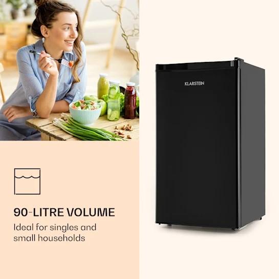 Chladnička, Objem: 90 litrov, Ročná spotreba energie: 110 kWh/rok, Nastaviteľná teplota chladenia: 7 úrovní, Prevádzková hlučnosť: 42 dB