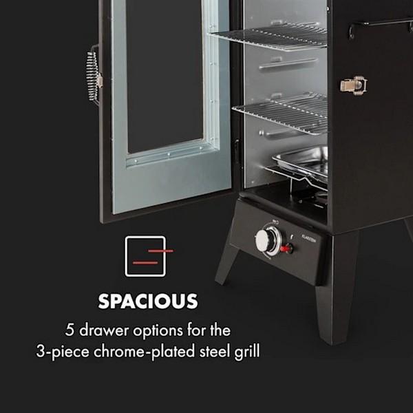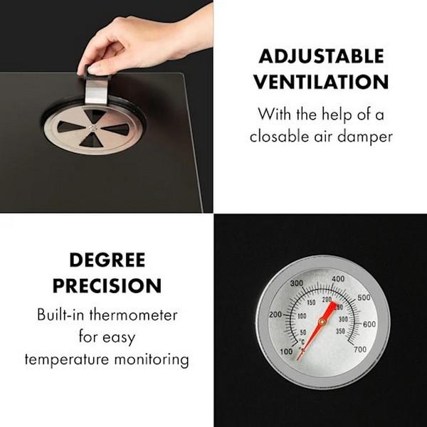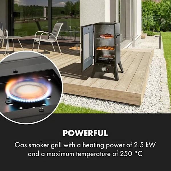 - Výkonný: plynový gril s udiarňou s tepelným výkonom 2,5 kW a maximálnou teplotou 250 °C
