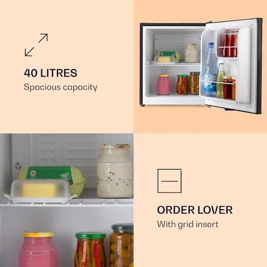 Chladnička, Čistý objem celkom 40 Ltr, Ideálna teplota okolia: 16 až 38 °C, Prevádzková hlučnosť: 39 dB max.