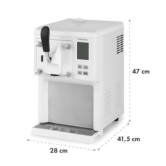 Ovládanie zmrzlinovača na zrozumiteľnom ovládacom poli je veľmi jednoduché. Počas prevádzky sa zostávajúci čas trvania prípravy zobrazuje na prehľadnom LC displeji. Po uplynutí času prípravy sa zmrzlinovač automaticky prepne priamo do trojhodinového chladiaceho režimu, aby sa zamrznutá lahôdka rozplynula až na jazyku a neroztopila sa v prístroji. Čerešničkou na torte, v tomto prípade na zmrzline, je pri zariadení Klarstein Sahnehäubchen jeho dávkovací systém a automatické čistenie. Hotovú zmrzlinu si môžete pomocou páky natočiť priamo do zmrzlinového pohára alebo do kornútka, podobne ako pri soft-ice zmrzlinovači. Automatická funkcia čistenia privádza toto zariadenie do dokonalosti.