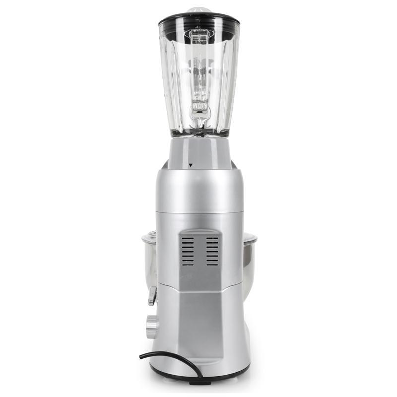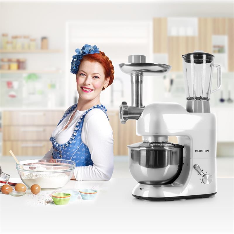 Klarstein Lucia Argentea je silný kuchynský robot , ktorý má nástavce na miešanie, hnetenie, mlynček na mäso a mixovací pohár.