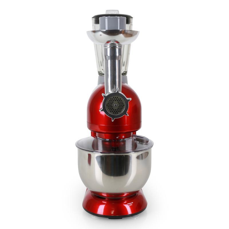 Klarstein Lucia Rossa je silný kuchynský robot , ktorý má nástavce na miešanie, hnetenie, mlynček na mäso a mixovací pohár.