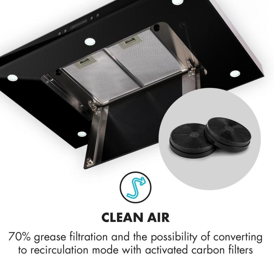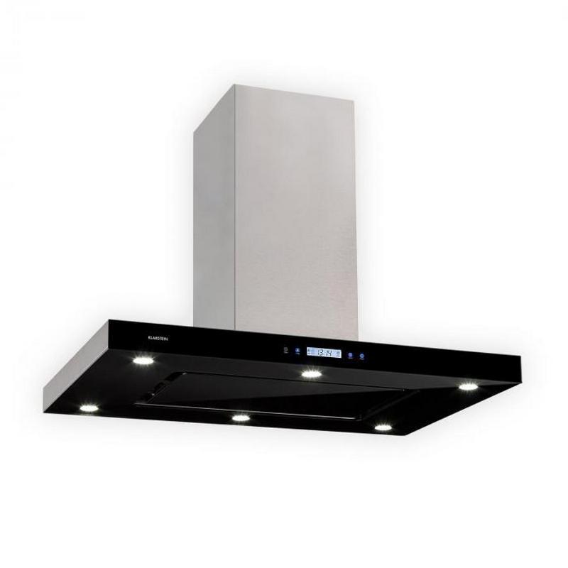 Najkrajšia účinnosť: ostrovčekový digestor Klarstein Valeria oslobodzuje kuchyne od pary a výparov a obohacuje ich o elegantný doplnok s lesklým vzhľadom z ušľachtilej ocele s luxusnými čiernymi sklenenými prvkami na prednej aj zadnej strane a tiež v časti krytu digestora.