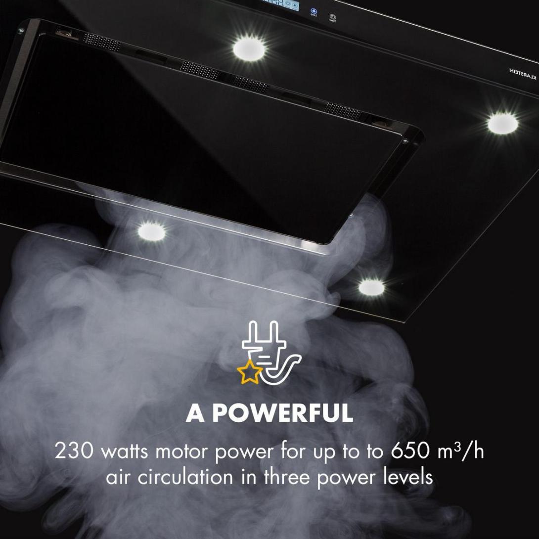 Priestorový digestor, Silný: výkon motora 230 W pre až do 650 m3 odpadového vzduchu za hodinu v troch úrovniach výkonu, Jednoduché ovládanie: dotykový ovládací panel s LED displejom