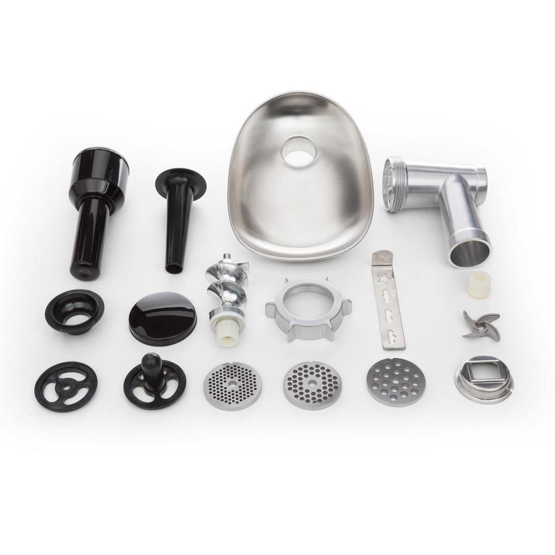 - Početné príslušenstvo s tromi kotúčmi s otvormi, sadou na napĺňanie klobás, vrátane nadstavca na prípravu kebbe a nadstavca na čajové pečivo.