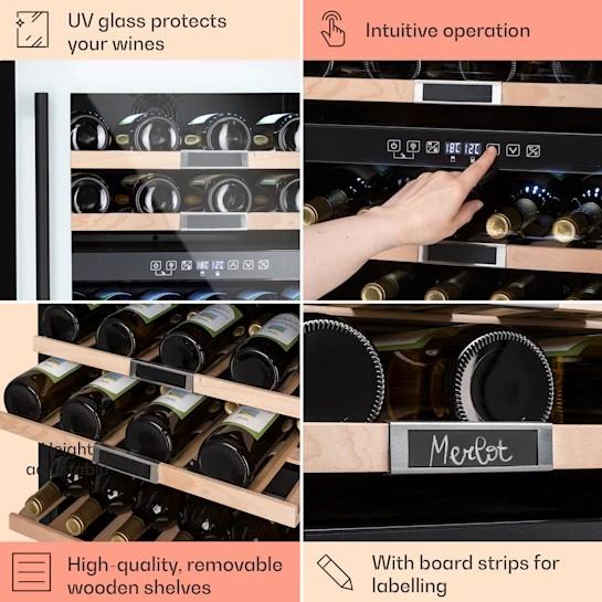 Vinotéka, Objem 85 litrov, 2 chladiace zóny: Nastaviteľné v rozsahu 5 - 22 °C, 36 fliaš vína, Prevádzkový hluk: max. 41 dB.