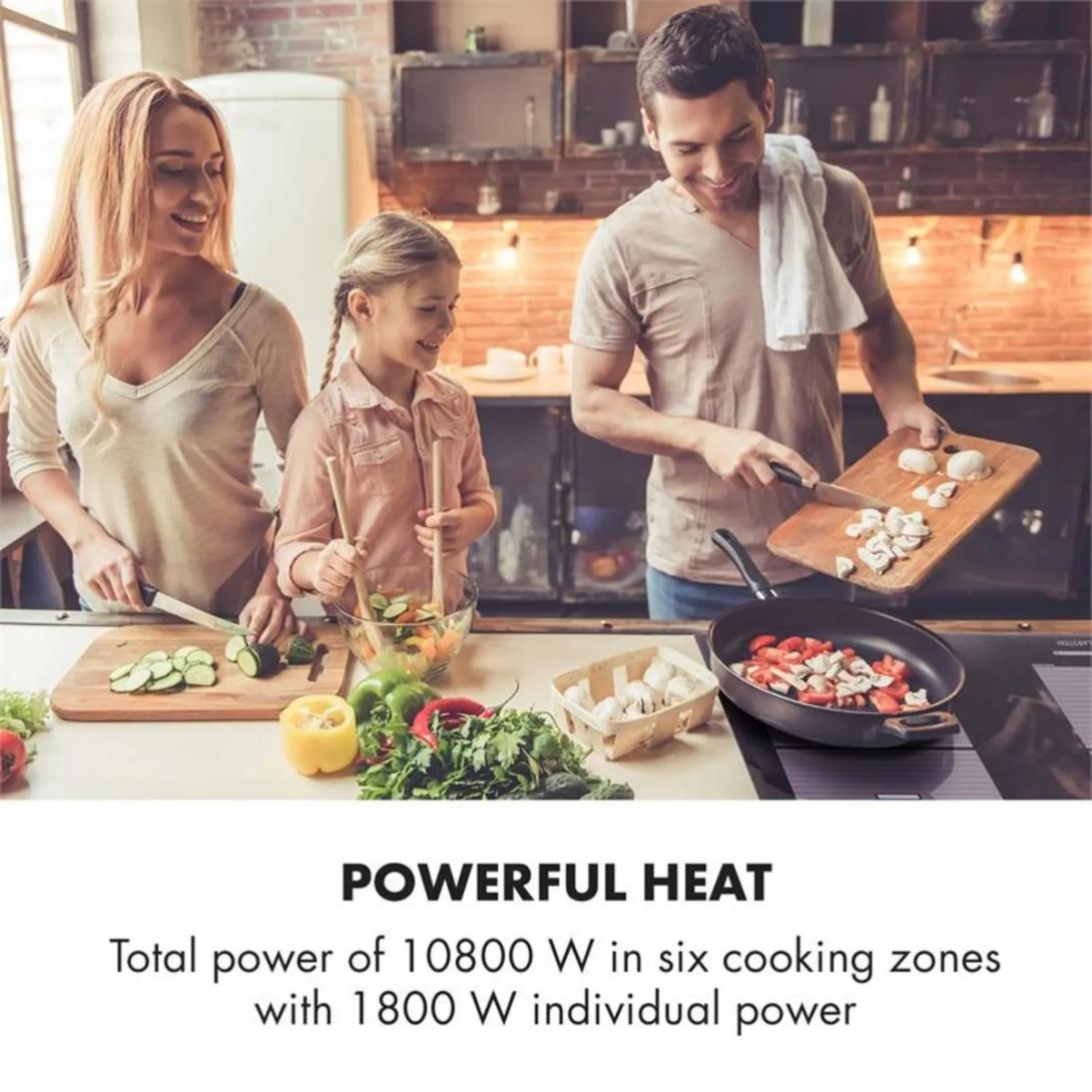 - Výkonné teplo: celkový výkon 10800 W v šiestich varných zónach, každá s individuálnym výkonom 1800 W