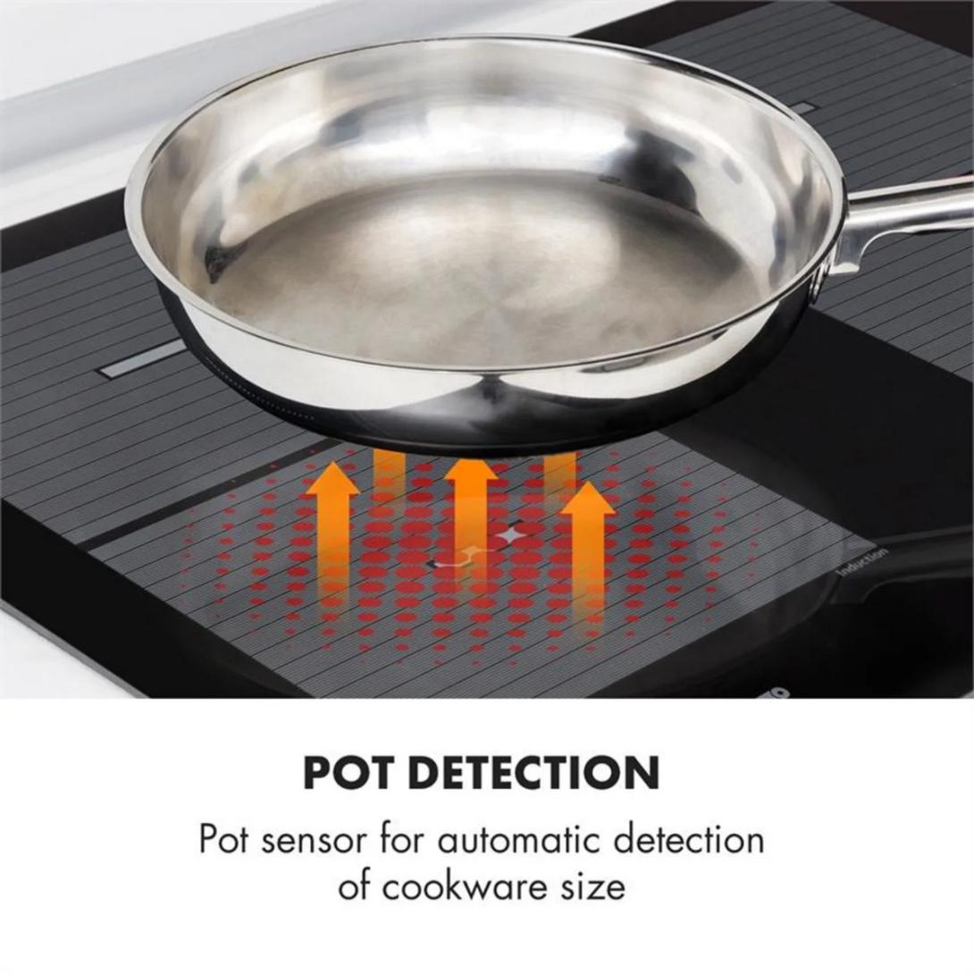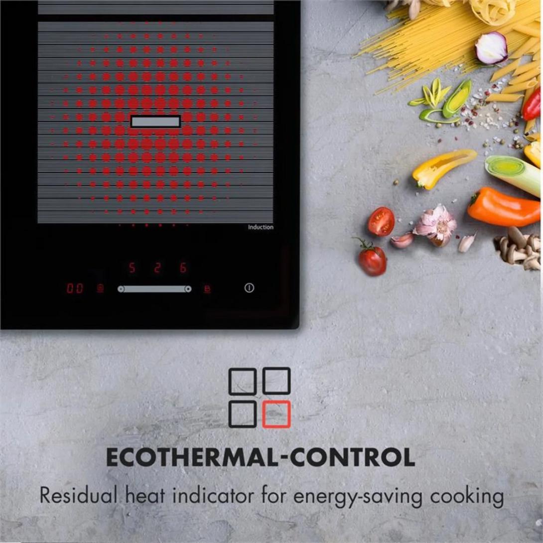 Vstavaná varná doska Klarstein Virtuosa Flex 90 ponúka štyri varné platne s celkovým výkonom až 10800 W (6 x 1800 W) - vďaka čomu obsah hrncov a panvíc zovrie v špičkových časoch. Pritom sa varné zóny zjednocujú po dve do flexi zón v princípe VarioHeating: Vďaka funkcii rozpoznania veľkosti hrncov sa s maximálnou flexibilitou prispôsobujú veľkosti hrncov, panvíc alebo kastrólov, umiestnených na vrchu, a môžu byť tiež spoločne použité na rozpálenie veľkého kuchynského riadu. Na jednej strane zariadenie Virtuosa Flex 90 naozaj využíva len energiu, ktorá je vhodná pre daný hrniec, a na druhej strane umožňuje používať takmer akúkoľvek veľkosť hrnca alebo panvice. Výkon všetkých plôch je možné ovládať samostatne a majú k dispozícii funkciu ThermoBoost, ktorá zvyšuje výkon s cieľom rýchleho zohrievania na 3000 W. Sklokeramická varná doska Klarstein Virtuosa Flex 90 je ľahko ovládateľná pomocou integrovaného dotykového posuvného panela s digitálnym displejom tak, aby hladkú plochu kuchynskej linky neprerušovali žiadne ďalšie regulátory a gombíky. Okrem výkonu sa dá naprogramovať aj časovač až na 99 minút pre každú varnú dosku. Časovač buď vypne varnú dosku po uplynutí nastaveného času, alebo vydá akustický signál.