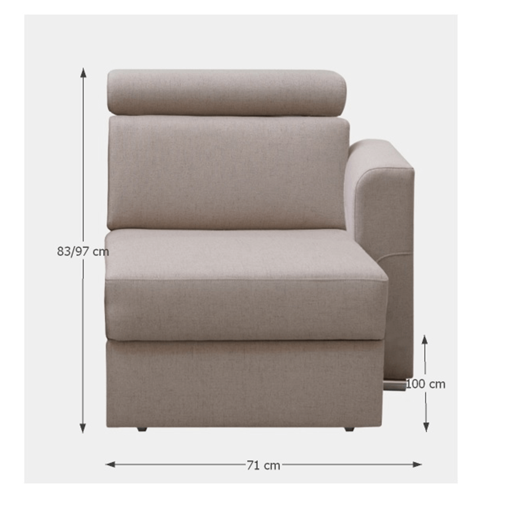 1-sed 1 1B P k sedacej súprave MARIETA, pravé prevedenie, na objednávku Rozmery: (ŠxHxV): 71x100x83/97 cm Výška spodného priestoru od podlahy: 5 cm Materiál: látka CABLO Oderuodolnosť textílie podľa testu Martindale: 72 000 oderov Farba: béžová Nosnosť na osobu: 90 kg Dodávané v demonte, doba dodania 6-8 týždňov. Ponúkame vám možnosť zložiť si sedačku vo vlastnom rozmere a podľa vlastných potrieb. Komponenty na zloženie hľadajte v našej ponuke. Máme pre vás hneď sedem farieb látky Cablo a sedem farieb ekokože, kombinovať teda môžete podľa ľubovôle. Odtiene nájdete v priloženom vzorkovníku. Výber farebného odtieňa poznačte pri objednávaní priamo do poznámky. Pri individuálnej objednávke je potrebné zaplatiť 10% zálohu z danej sumy. Po uhradení zálohy bude Vaša požiadavka zadaná do výroby. Doba dodania 6-8 týždňov. Cena takto zloženej sedačky v inej farbe závisí od počtu jednotlivých dielov, ktoré ju tvoria. Odporúčame preveriť si konečnú cenu.