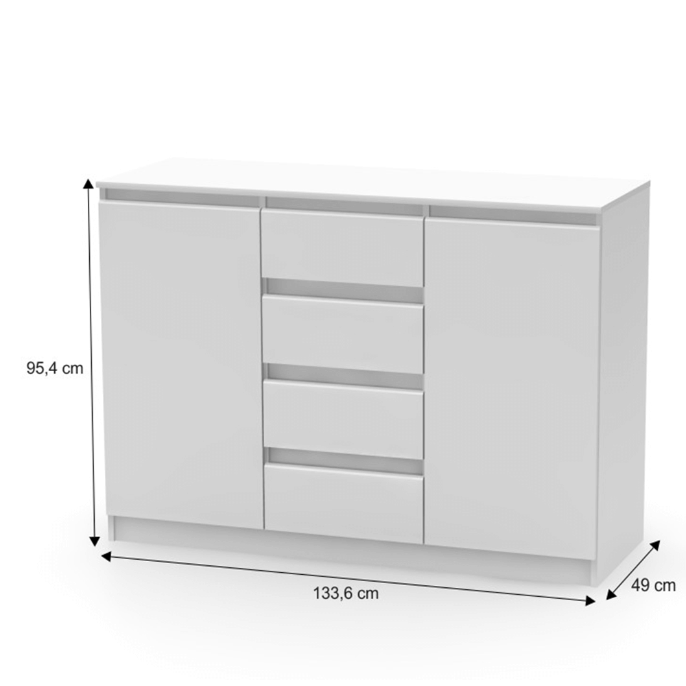 2 dverová komoda so 4 šuplíkmi HANY NEW 010Materiál: DTD laminovanáFarba: bielaRozmery (ŠxHxV): 133,6x49x95,4 cmHrúbka materiálu: 16 mmV ľavej aj pravej strane 2 policePre každú policu zvislo 3 predvŕtané diery s roztečou 3,2mmABS hranyKvalitný slovenský výrobok.Dodávané v demonte.