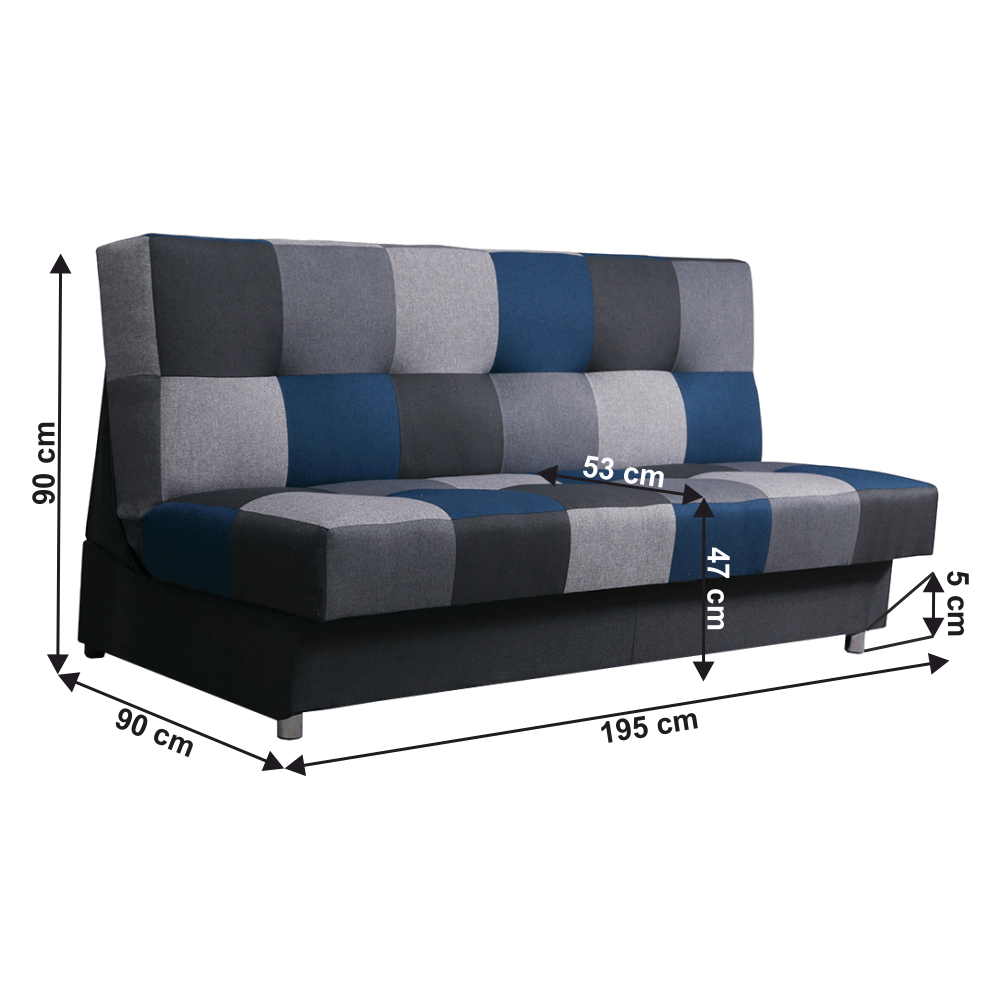 Materiál: látka MalmoFarba: modrá/siváRozmery (ŠxHxV): 195x90x90 cmVýška spodného priestoru od podlahy: 5 cmRozkladaciaRozkladanie systémom KLIK KLAKPlocha na spanie: 195x116 cmNosnosť na osobu: 90 kgS úložným priestoromBonelová výplň sedacej častiVýška sedu: 47 cmHĺbka sedu: 53 cmNa nožičkáchDodávaná v demonte