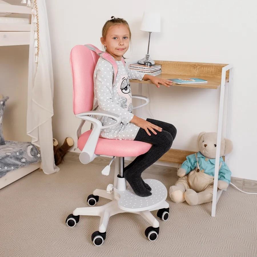 Každý rodič chce pre svoju ratolesť to najlepšie a výnimkou nie je ani sedenie pri stole. Všetky zručnosti ako písanie, kreslenie, aj učenie veľmi ovplyvňuje správne vybavenie pracovného kútika. Práve preto venujte pozornosť výberu pohodlnej stoličky. ANAIS je ergonomické kreslo, ktoré si zamiluje každé dieťa. Ide o otočnú rastúcu stoličku, ktorá sa prispôsobí každému žiakovi či študentovi. Kreslo vyniká multifunkčnosťou, pohodlnosťou a moderným dizajnom. Vek dieťaťa pri tomto kresle vôbec nerozhoduje. Pýtate sa prečo? Anais má totiž funkciu nastaviteľnej výšky sedu, a navyše aj nastaviteľnú hĺbku sedu. Rastie teda spolu s dieťaťom, čo je zárukou toho, že kreslo nebudete musieť meniť niekoľko rokov. Pre bezpečnosť a ako opora pre unavené ruky sú tu opierky rúk, ktoré disponujú funkciou sklápania. Keď ich sklopíte dozadu, stoličku pokojne zasuniete pod stôl. Pre menšie deti je tu podnož na nohy, ktorá je výškovo nastaviteľná, a dokonca aj odnímateľná. Ak ju teda nebudete potrebovať, jednoducho ju zložíte a uschováte. Špeciálne navrhnutá opierka na chrbát má dokonalú vychytávku, ktorou sú traky. Tieto traky zabezpečujú nielen bezpečnosť, ale aj správne držanie tela, ktoré treba pri hrách či školských povinnostiach dodržiavať už od malíčka. Traky môžete kedykoľvek z kresla zložiť. Okrem toho, že kreslo prispieva k správnemu tvarovaniu chrbtice dieťaťa, znižuje zaťaženie a únavu počas učenia alebo maľovania. Stabilitu kreslu dodáva päťcípa ružica zakončená univerzálnymi kolieskami, ktoré sú vhodné na mäkké, ale aj tvrdé podlahy. Kolieska majú špeciálnu bezpečnostnú poistku (brzdu), ktorá zabraňuje tomu, aby sa kreslo posúvalo po podlahe. Keď dieťa v kresle sedí, kolieska sú zaistené. Dieťa sa svojvoľne nedokáže odsunúť od stola. Farebné prevedenie ružová/biela zapadne do každej dievčenskej izby. ANAIS nie je len stolička, je to ergonomický spoločník pre deti všetkých vekových kategórií. Všetky tieto opatrenia a funkcie zabezpečia vášmu dieťaťu dokonalý a zdravý štart do učenia a získavania ďalších vedomostí.