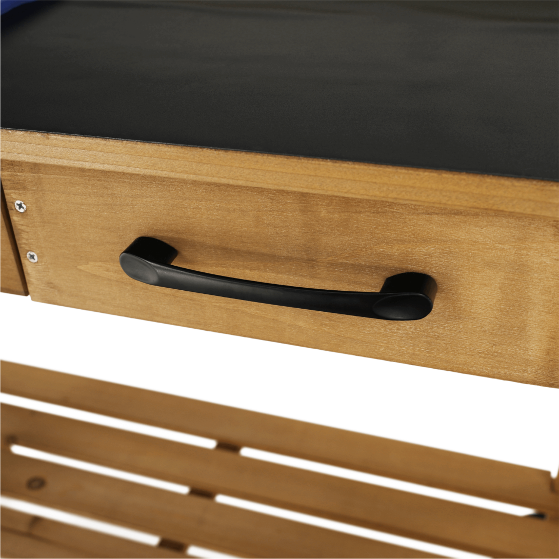 Materiál konštrukcia: drevoMateriál povrch stola: polypropylénFarba: hnedá/čiernaRozmery (ŠxHxV): 94x49x120 cmNosnosť: 15 kgPracovná plochaS policouS praktickým šuplíkomObsahuje tri háčiky na zavesenieNa dvoch kolieskachDodávané v demonte