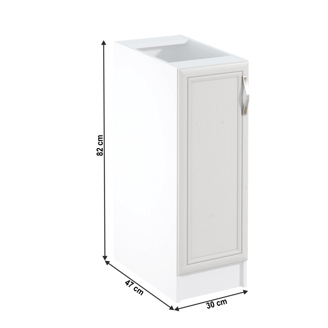 Spodná skrinka D30 s dvierkami, ľavá ku kuchyni SICILIAPrevedenie: DTD laminovaná/MDF lištyFarba: biela/sosna AndersenRozmery (ŠxHxV): 30x47x82 cmHrúbka materiálu: 15 mmSpodné skrinky ku kuchyni SICILIA sú dodávané bez pracovnej dosky. Môžete si objednať pracovnú dosku vo farebnom prevedení dub pieskovec v hrúbke 2,8 cm za 49 eur/bm a pracovnú dosku vo farebnom prevedení dub Lancelot v hrúbke 3,8 cm za 56 eur/bm.