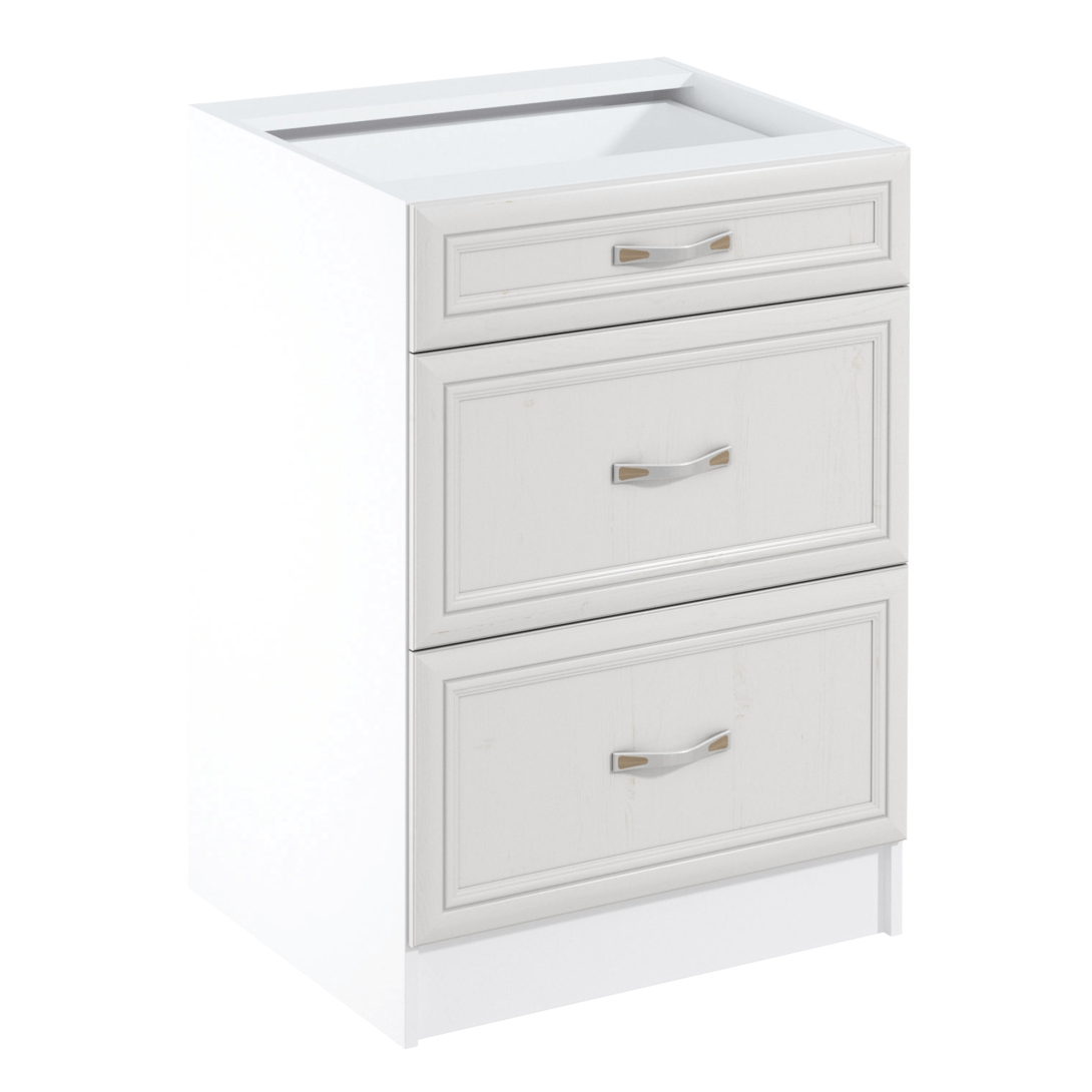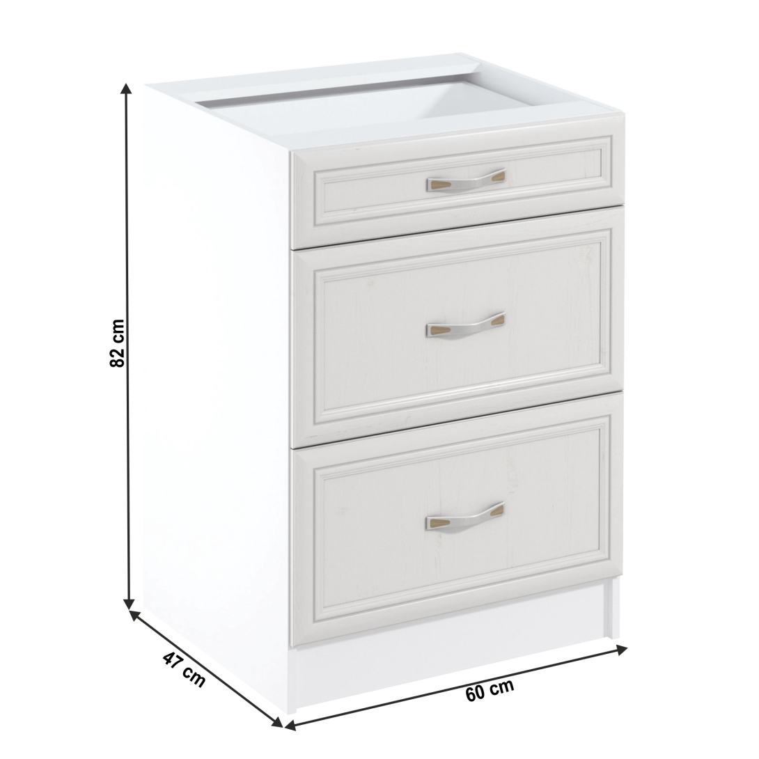 Spodná skrinka D60S3 s tromi šuplíkmi ku kuchyni SICILIAPrevedenie: DTD laminovaná/MDF lištyFarba: biela/sosna AndersenRozmery (ŠxHxV): 60x47x82 cmHrúbka materiálu: 15 mmSpodné skrinky ku kuchyni SICILIA sú dodávané bez pracovnej dosky. Môžete si objednať pracovnú dosku vo farebnom prevedení dub pieskovec v hrúbke 2,8 cm za 49 eur/bm a pracovnú dosku vo farebnom prevedení dub Lancelot v hrúbke 3,8 cm za 56 eur/bm.