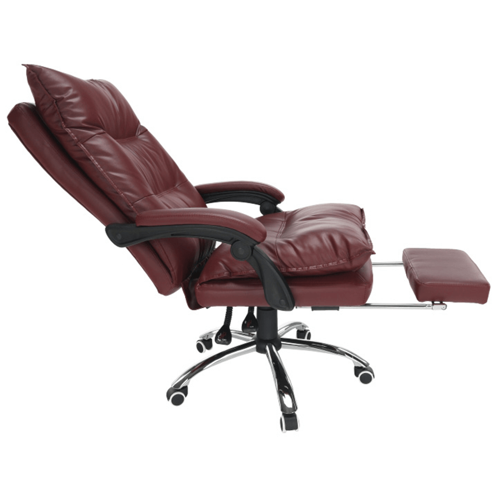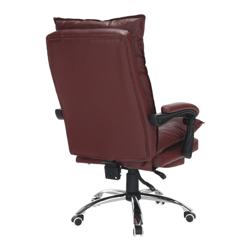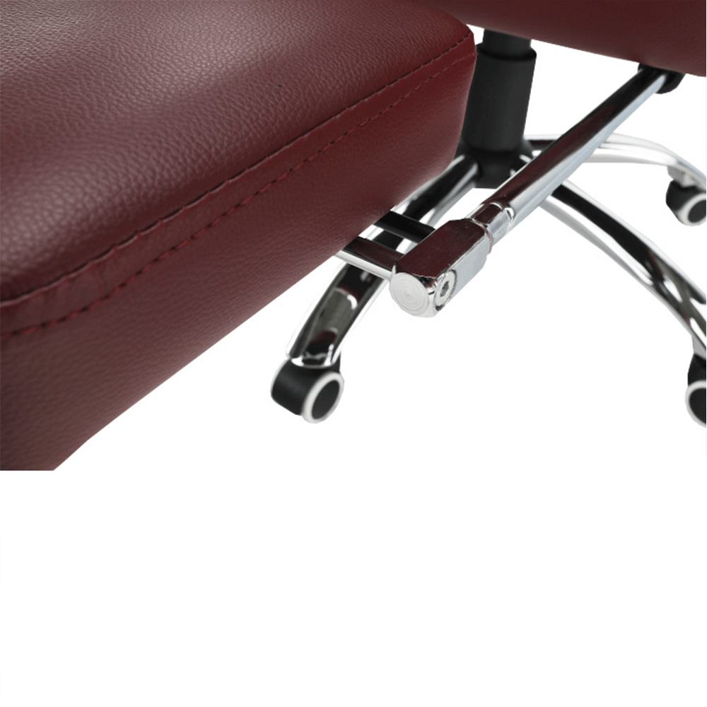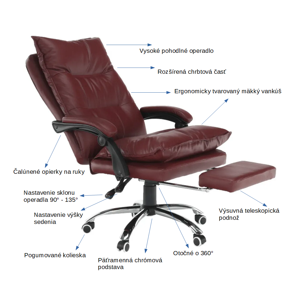 Kancelárske kreslo DRAKE s polohovacou opierkou chrbta a výsuvnou podnožou. Materiál: ekokoža/kovOderuodolnosť ekokože podľa testu Martindale: 100 000 oderovFarba: bordová/chrómRozmery (ŠxHxV): 72x85x111-118 cm Výška sedu: 56-64 cmHĺbka sedu: 51Výška od zeme po opierku na ruky: 67-75 cmNosnosť: 110 kgVýsuvná teleskopická podnožOtočná o 360°Nastavenie sklonu operadla 90° - 135°S ergonomickými vankúšmi na operadle a sedadleMožnosť nastaviť výšku seduRozšírená chrbtová časťČalúnené plastové opierky na rukyPäťramenná chrómová podstavaUniverzálne kolieska vhodné na mäkké aj tvrdé podlahyDodávané v demonte