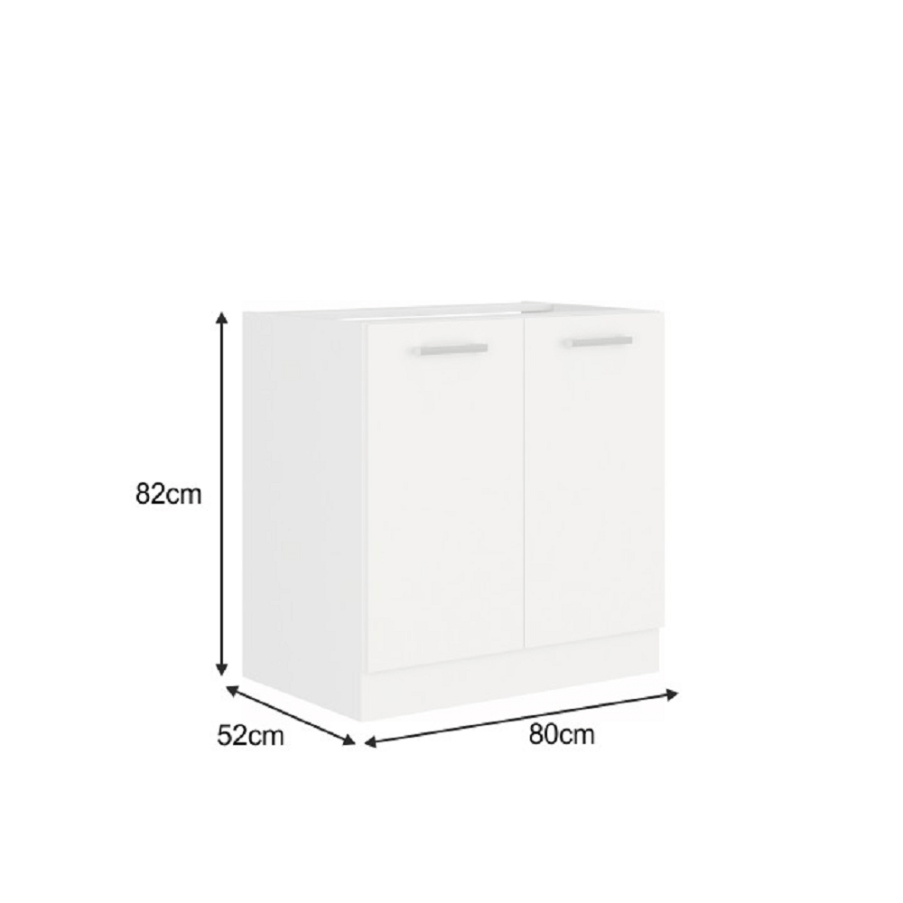 Drezová skrinka Split 80 ZL 2F BBMateriál: DTD laminovanáFarba: bielaRozmery (ŠxHxV): 80x52x82 cmDodávané v demonteSpodné skrinky sú dodávané vrátane dolnej lišty. Pracovná doska nie je súčasťou skriniek. Je možné si doobjednať pracovnú dosku v prevedení dub lancelot za 55 eur/bm. Možnosť dokúpenia univerzálneho Ľ/P drezu LAY ON.