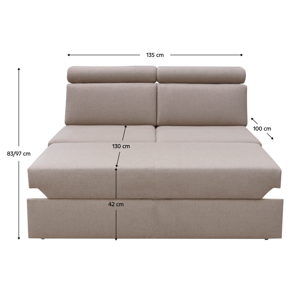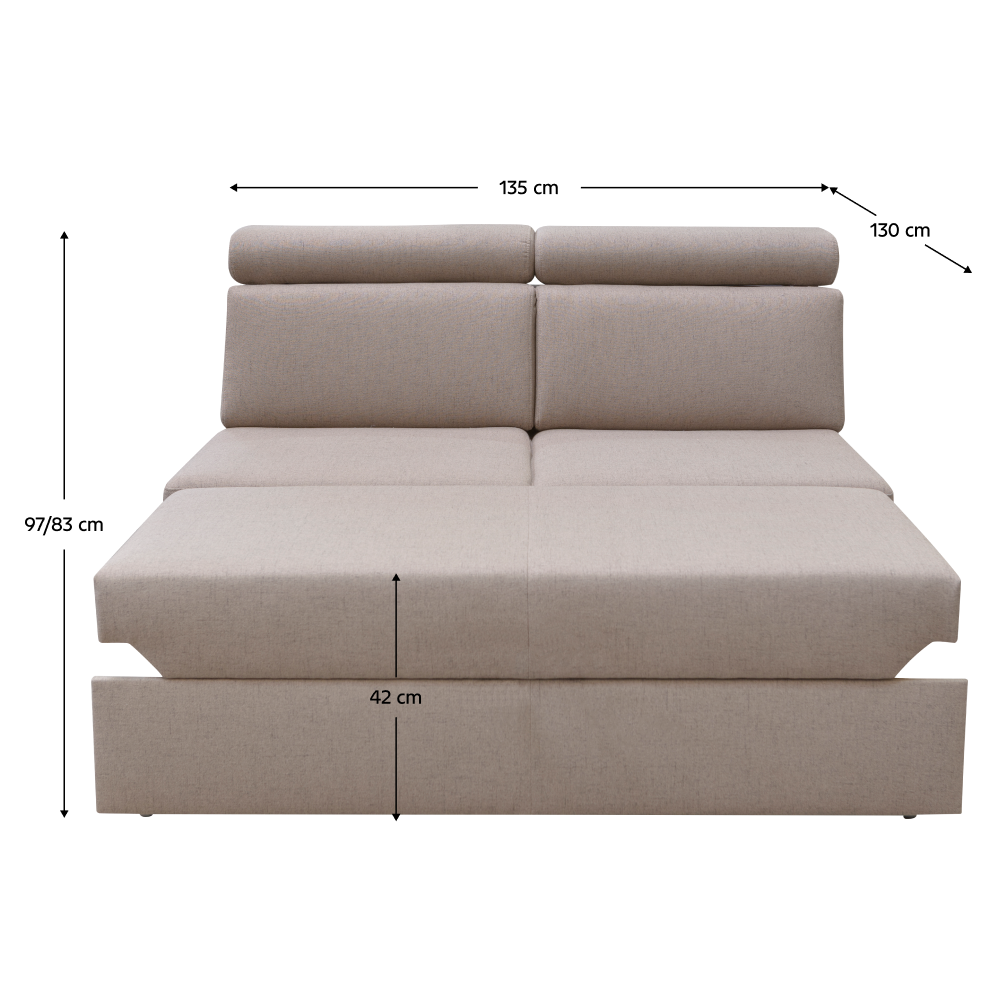 Dvojsed 2 BB ZF k sedacej súprave MARIETA, na objednávku, rozkladací Rozmery: (ŠxHxV): 135x100x83/97 cm Nosnosť na osobu: 90 kg Výška spodného priestoru od podlahy: 5 cm Materiál: látka CABLO Oderuodolnosť textílie podľa testu Martindale: 72 000 oderov Farba: béžová Dodávané v demonte, doba dodania 6-8 týždňov. Ponúkame vám možnosť zložiť si sedačku vo vlastnom rozmere a podľa vlastných potrieb. Komponenty na zloženie hľadajte v našej ponuke. Máme pre vás hneď sedem farieb látky Cablo a sedem farieb ekokože, kombinovať teda môžete podľa ľubovôle. Odtiene nájdete v priloženom vzorkovníku. Výber farebného odtieňa poznačte pri objednávaní priamo do poznámky. Pri individuálnej objednávke je potrebné zaplatiť 10% zálohu z danej sumy. Po uhradení zálohy bude Vaša požiadavka zadaná do výroby. Doba dodania 6-8 týždňov. Cena takto zloženej sedačky v inej farbe závisí od počtu jednotlivých dielov, ktoré ju tvoria. Odporúčame preveriť si konečnú cenu.