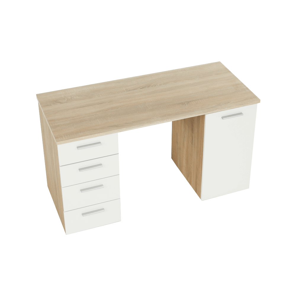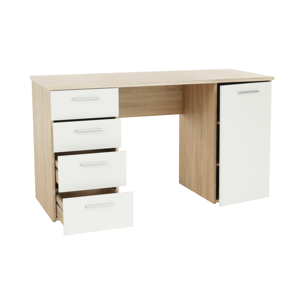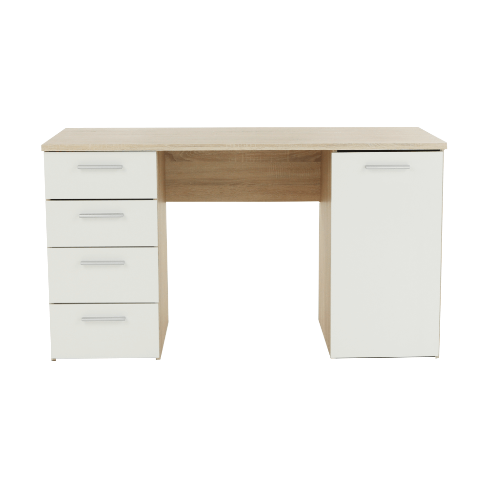 PC stôl EUSTACHMateriál: DTD laminovanáFarba: dub sonoma/bielaRozmery (ŠxHxV): 137x60x76,3 cmHrúbka materiálu: 16/22 mmRozmery skrinky (ŠxHxV): 37,8x60x76,3 cmŠtyri šuplíky, jedna skrinkaVýška plytších šuplíkov: 16 cmVýška hlbších šuplíkov: 19,4 cmDodávané v demonteKvalitný slovenský výrobok