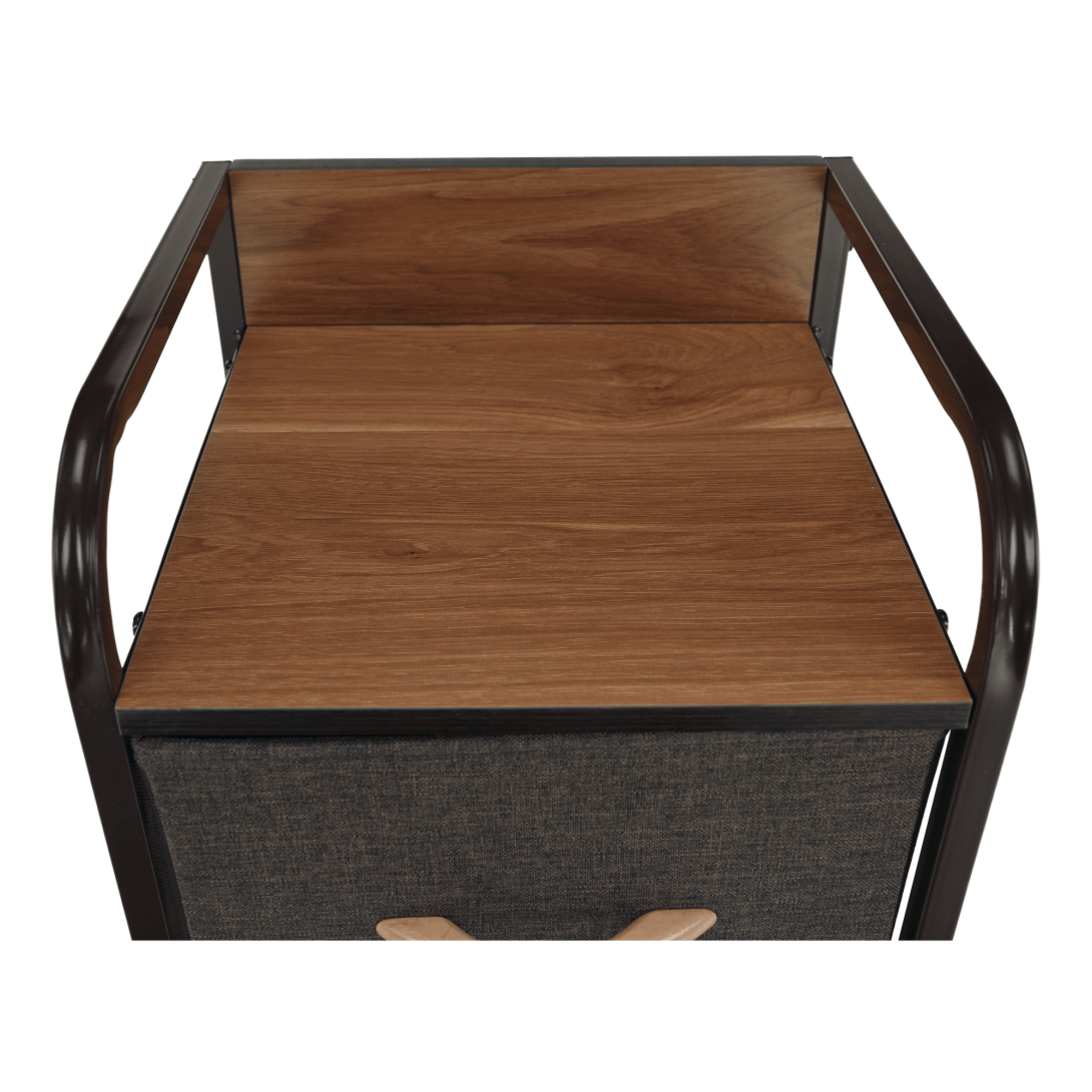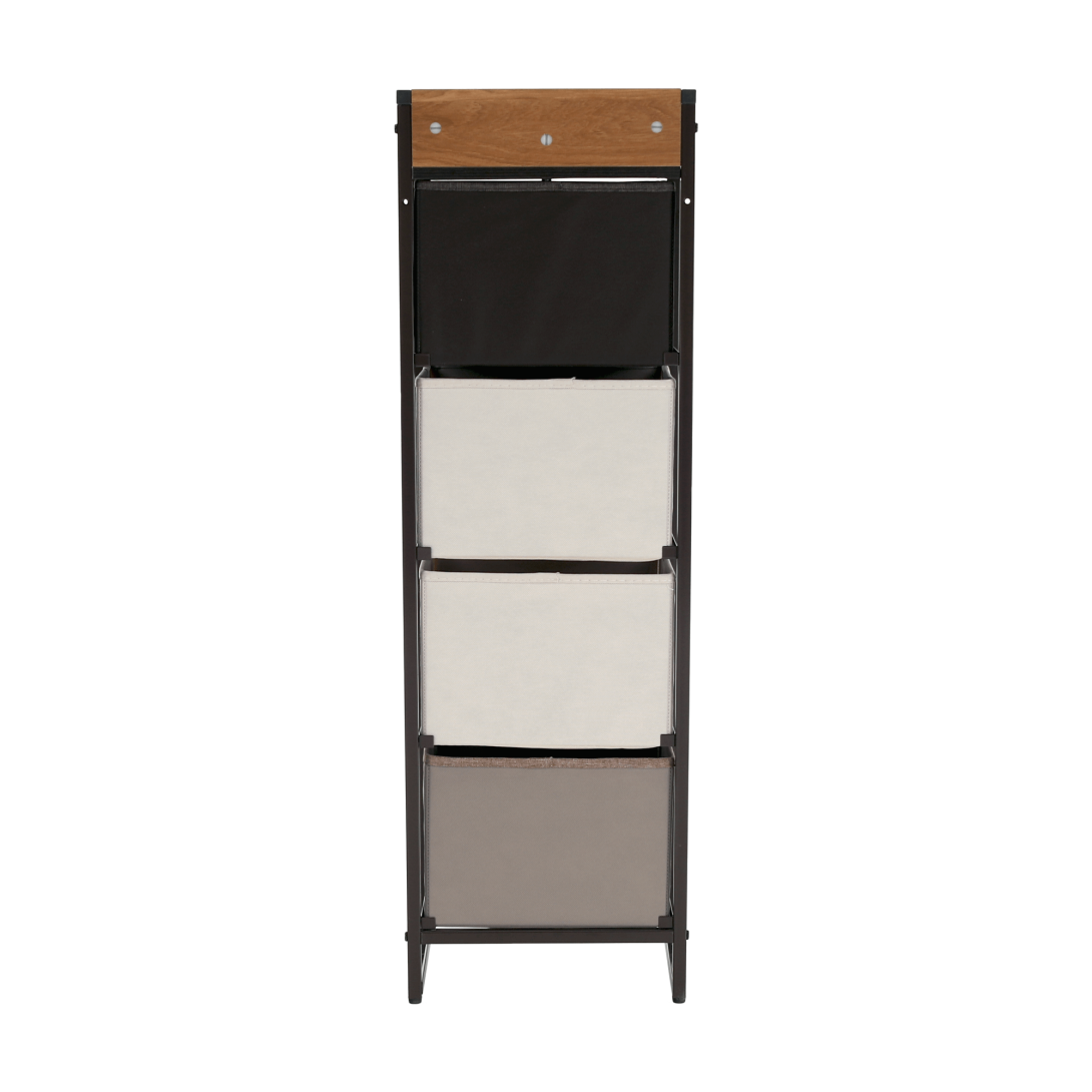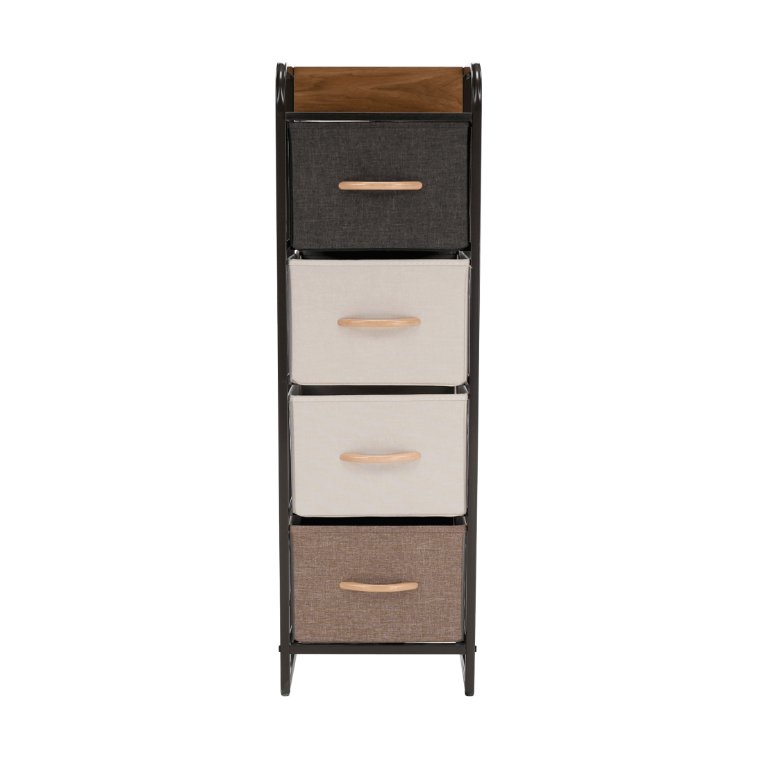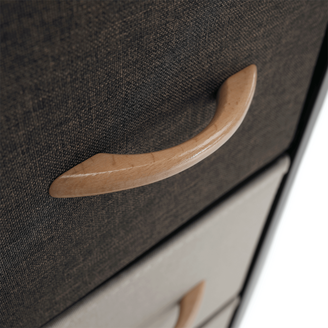Materiál: MDF/kov/látka/plastFarba: béžová/svetlohnedá/tmavohnedáRozmery (ŠxHxV): 31x29x99 cmHrúbka vrchného plátu: 1,2 cmŠtyri šuplíkyKovová konštrukciaLátkové šuplíkyS drevenými úchytkamiDodávané v demonte
