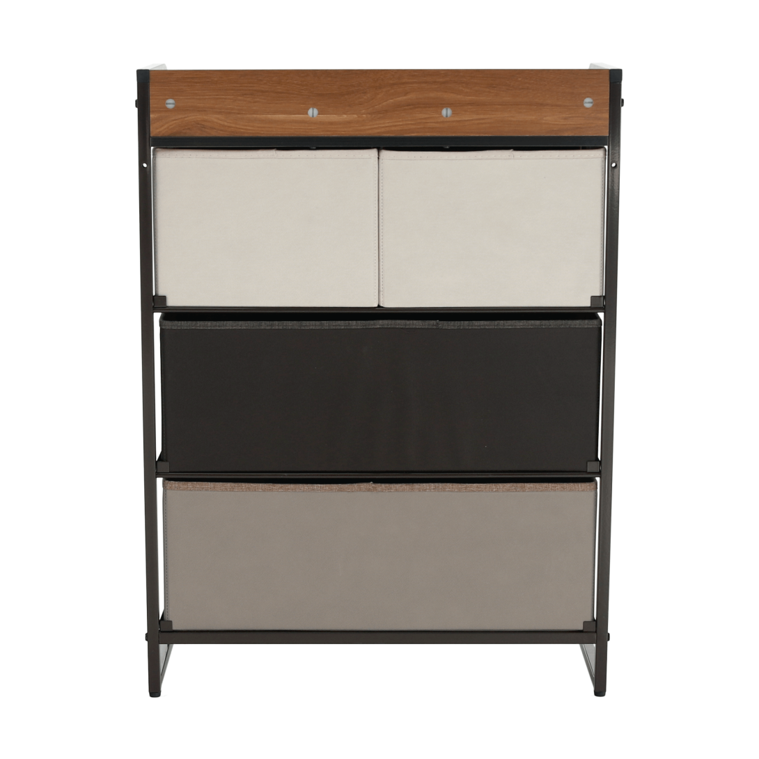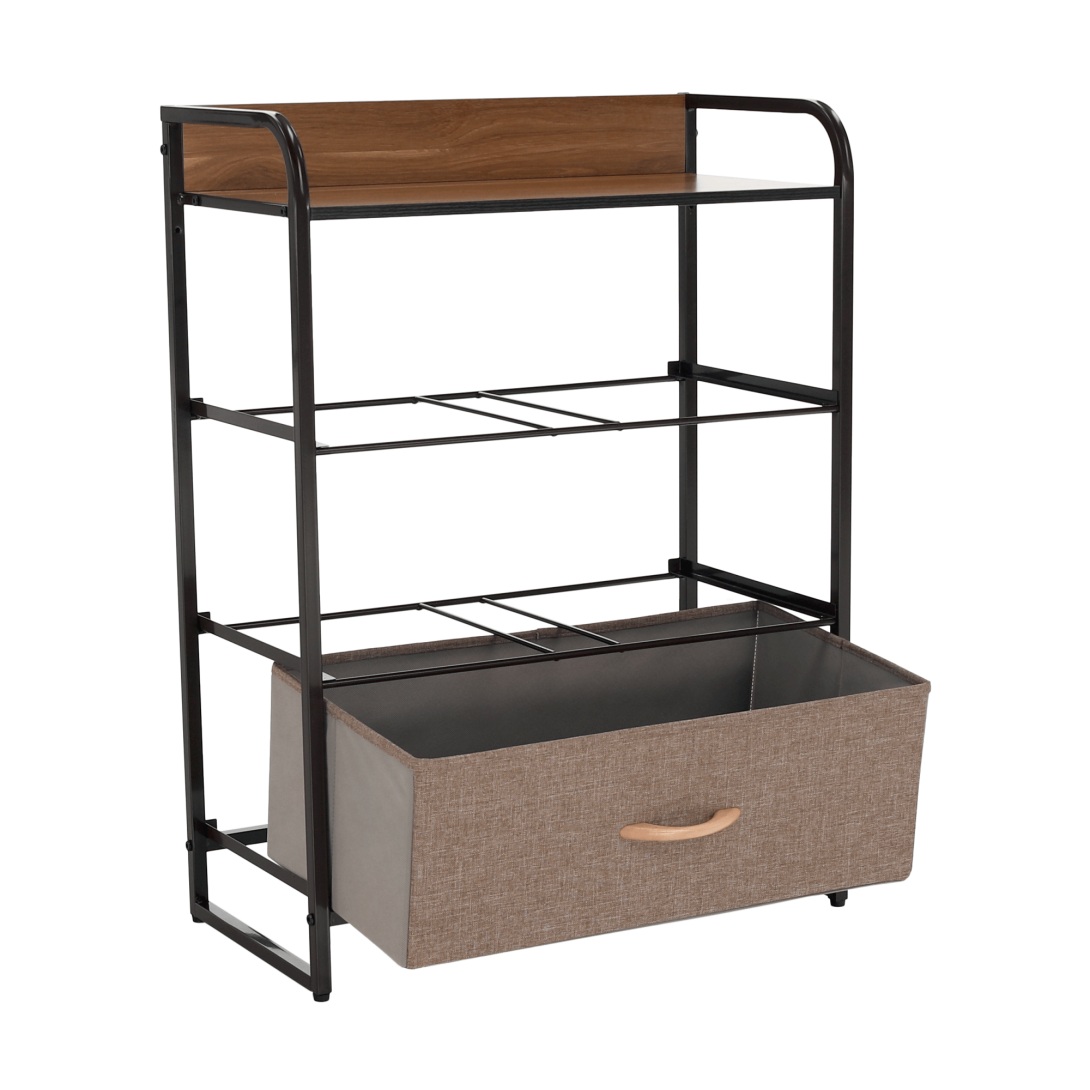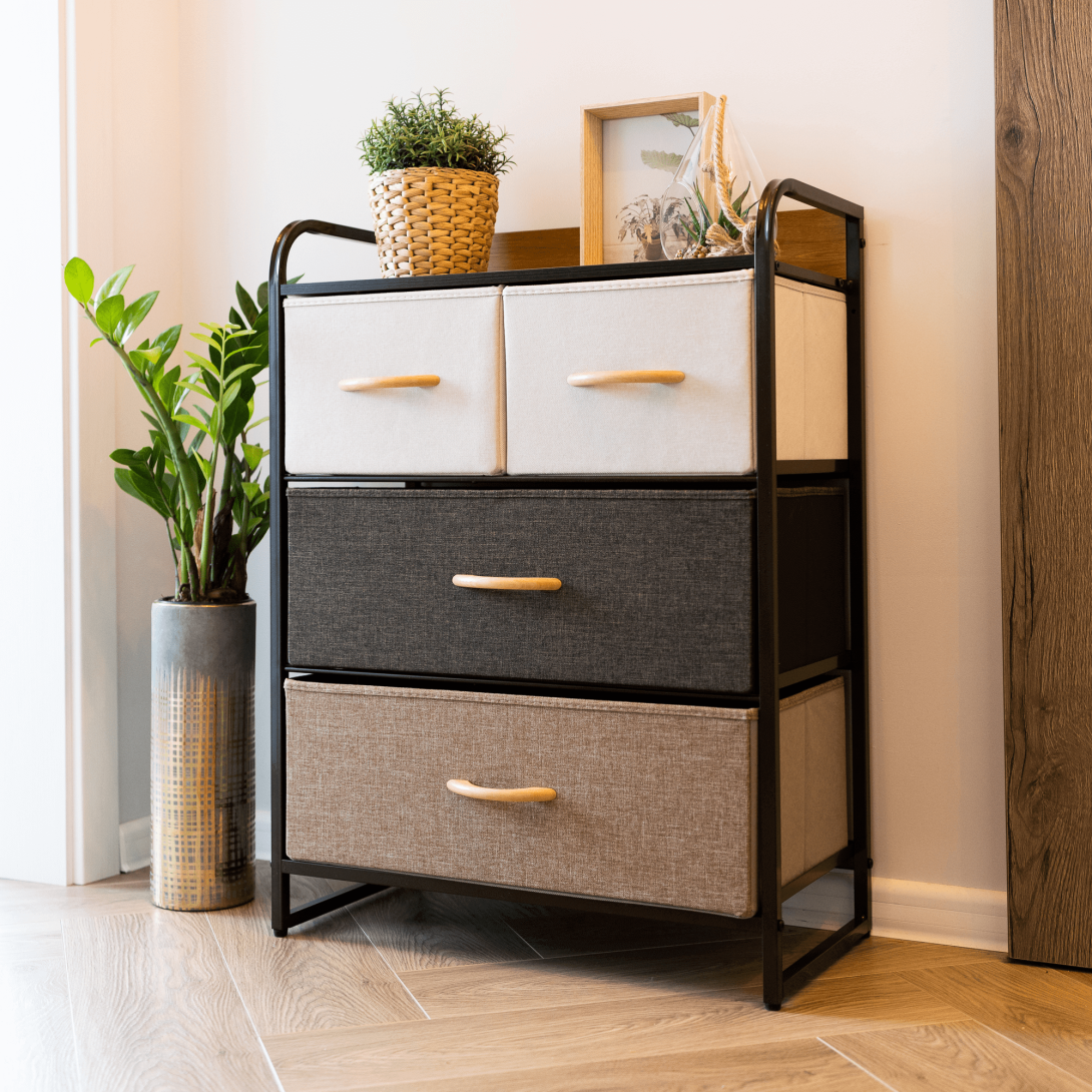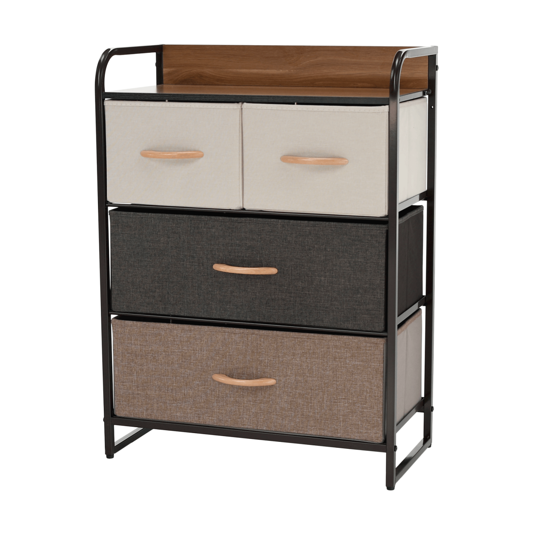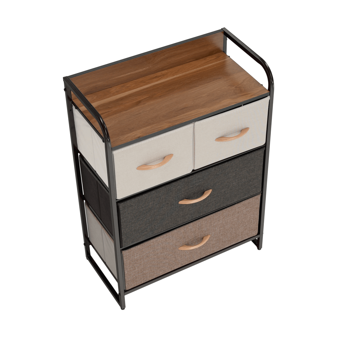 Materiál: MDF/kov/látka/plastFarba: béžová/svetlohnedá/tmavohnedáRozmery (ŠxHxV): 58x29x78,5 cmHrúbka vrchného plátu: 1,2 cmŠtyri šuplíkyKovová konštrukciaLátkové šuplíkyS drevenými úchytkamiDodávané v demonte