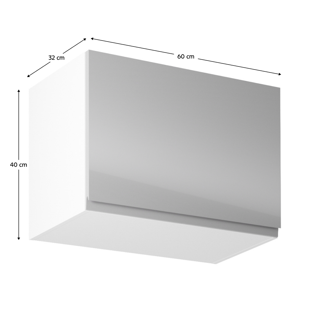 Horná skrinka, Aurora G60KPrevedenie: DTD laminovaná/MDFFarba: biela/sivá lakovaná extra vysoký lesk Rozmery (ŠxHxV): 60x32x40 cmHrúbka materiálu: 15 mmSystém tichého zatvárania dvierokPracovná doska nie je súčasťou skriniek. Je možné si doobjednať pracovnú dosku v prevedení dub artisan s hrúbkou 38 mm za 56 eur/bm. Možnosť dokúpiť drez LAY ON. Spodné skrinky sú dodávané vrátane dolnej lišty, avšak presný rozmer, ktorý potrebujete, je potrebné uviesť do poznámky v objednávke. Ak rozmer neuvediete, môže sa stať, že vám sokel nebude dodaný. Ku každej dolnej skrinke, okrem D25PZ, je potrebné doobjednať 2 ks úchytok na sokel - cena 1Eur/2ks.