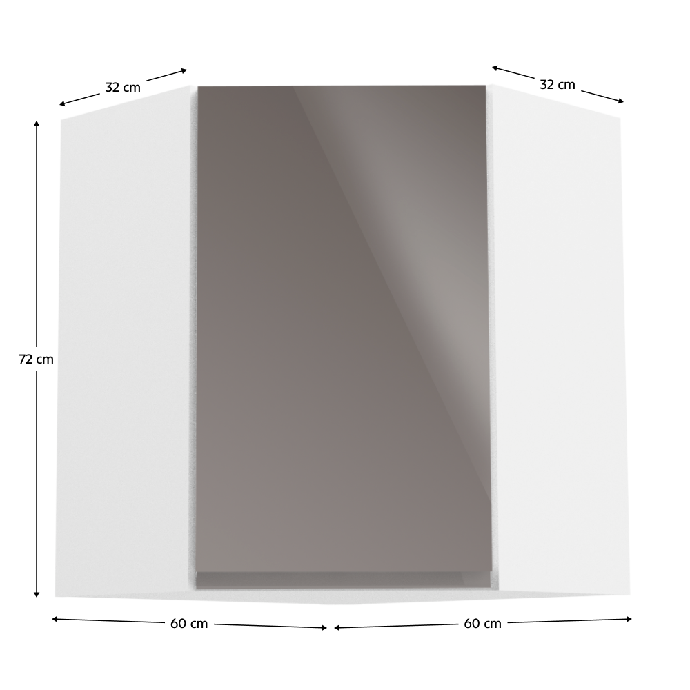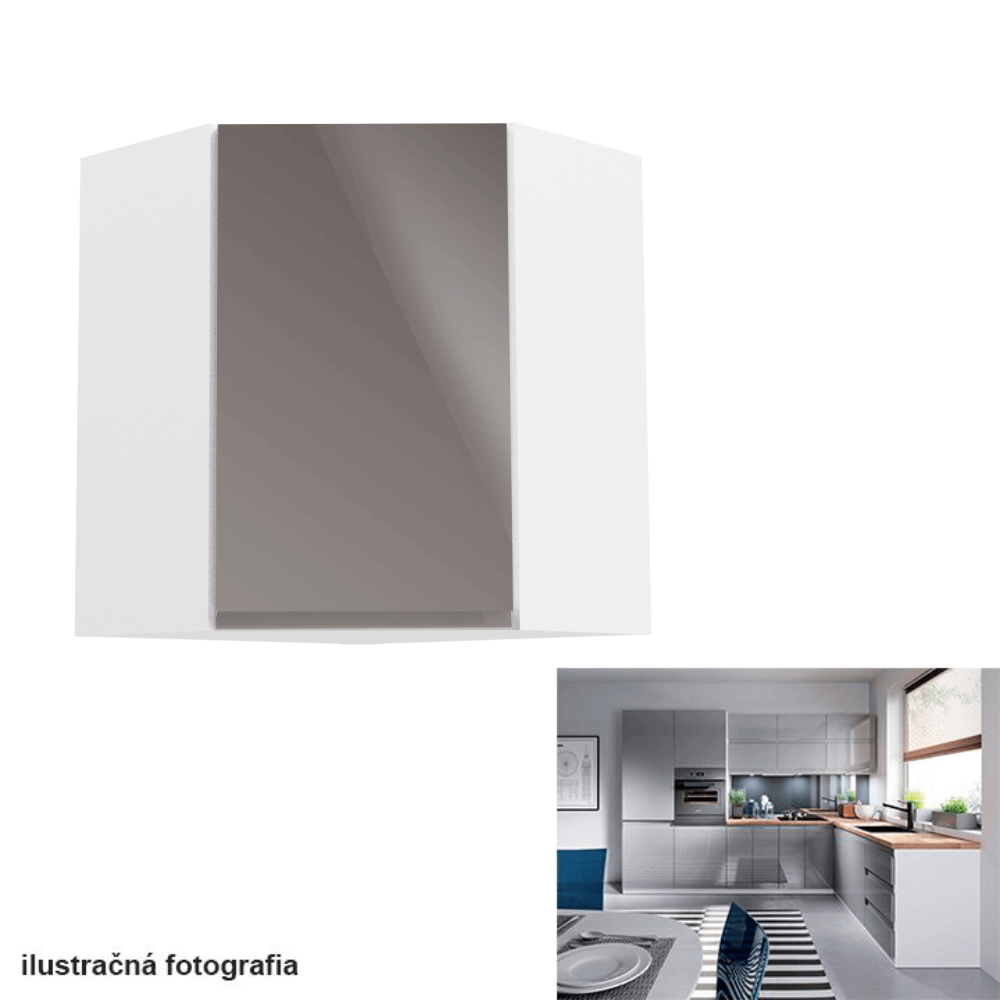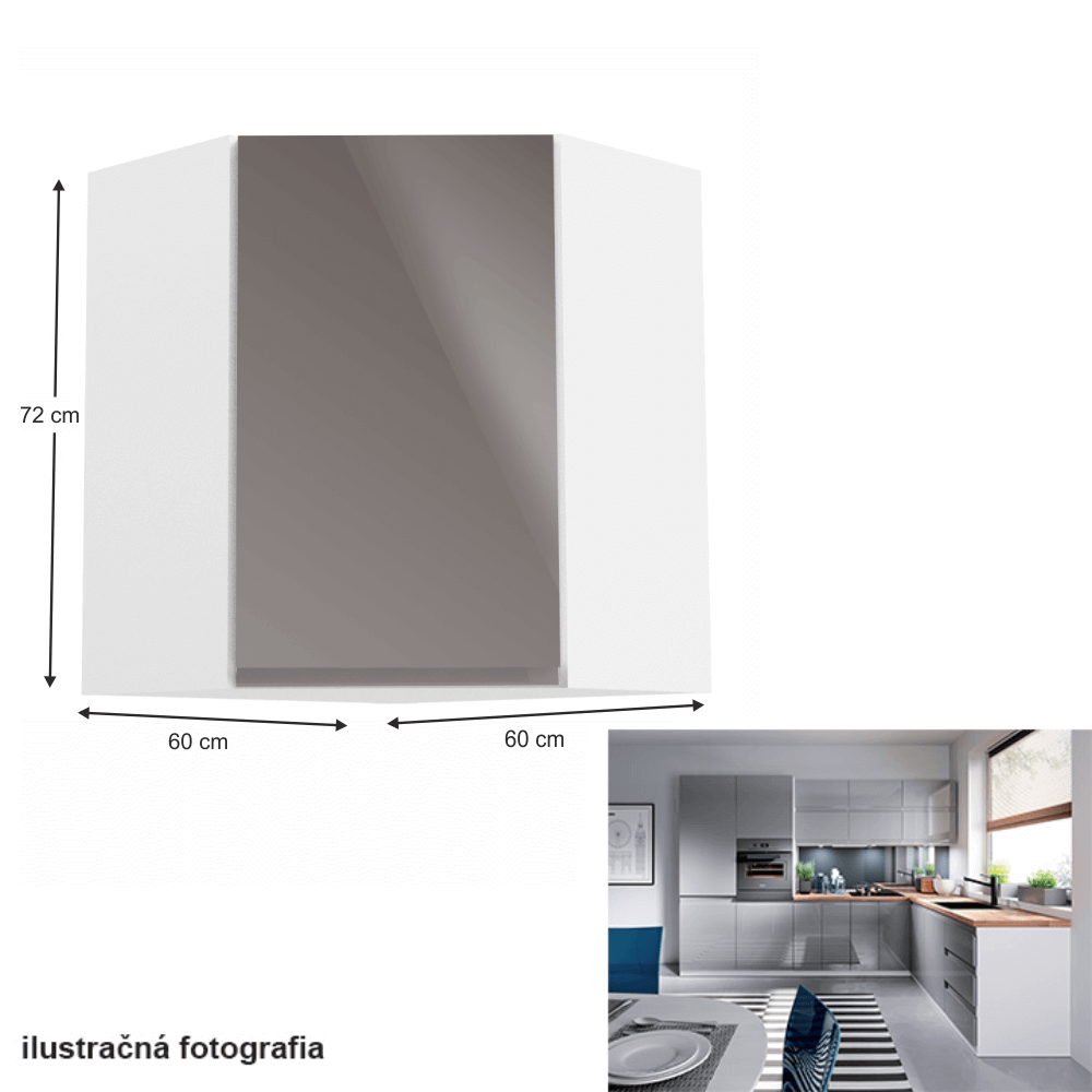 Horná skrinka, Aurora G60NPrevedenie: DTD laminovaná/MDFFarba: biela/sivá lakovaná extra vysoký lesk Rozmery (ŠxHxV): 60x60x72 cmHrúbka materiálu: 15 mm Pracovná doska nie je súčasťou skriniek. Je možné si doobjednať pracovnú dosku v prevedení dub artisan s hrúbkou 38 mm za 56 eur/bm. Možnosť dokúpiť drez LAY ON. Spodné skrinky sú dodávané vrátane dolnej lišty, avšak presný rozmer, ktorý potrebujete, je potrebné uviesť do poznámky v objednávke. Ak rozmer neuvediete, môže sa stať, že vám sokel nebude dodaný. Ku každej dolnej skrinke, okrem D25PZ, je potrebné doobjednať 2 ks úchytok na sokel - cena 1Eur/2ks.