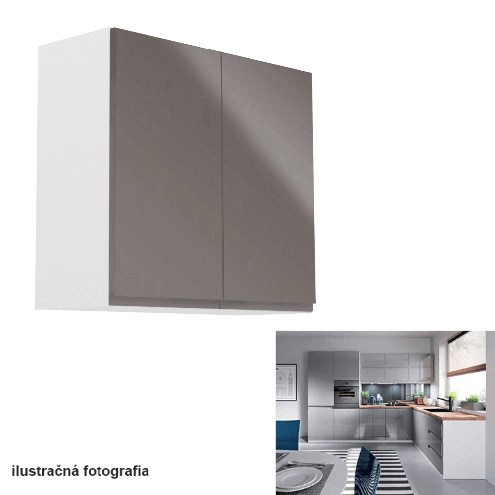 Horná skrinka, Aurora G80Prevedenie: DTD laminová/MDFFarba: biela/sivá lakovaná extra vysoký lesk Rozmery (ŠxHxV): 80x32x72 cmHrúbka materiálu: 15 mmSystém tichého zatvárania dvierokPracovná doska nie je súčasťou skriniek. Je možné si doobjednať pracovnú dosku v prevedení dub artisan s hrúbkou 38 mm za 56 eur/bm. Možnosť dokúpiť drez LAY ON. Spodné skrinky sú dodávané vrátane dolnej lišty, avšak presný rozmer, ktorý potrebujete, je potrebné uviesť do poznámky v objednávke. Ak rozmer neuvediete, môže sa stať, že vám sokel nebude dodaný. Ku každej dolnej skrinke, okrem D25PZ, je potrebné doobjednať 2 ks úchytok na sokel - cena 1Eur/2ks.