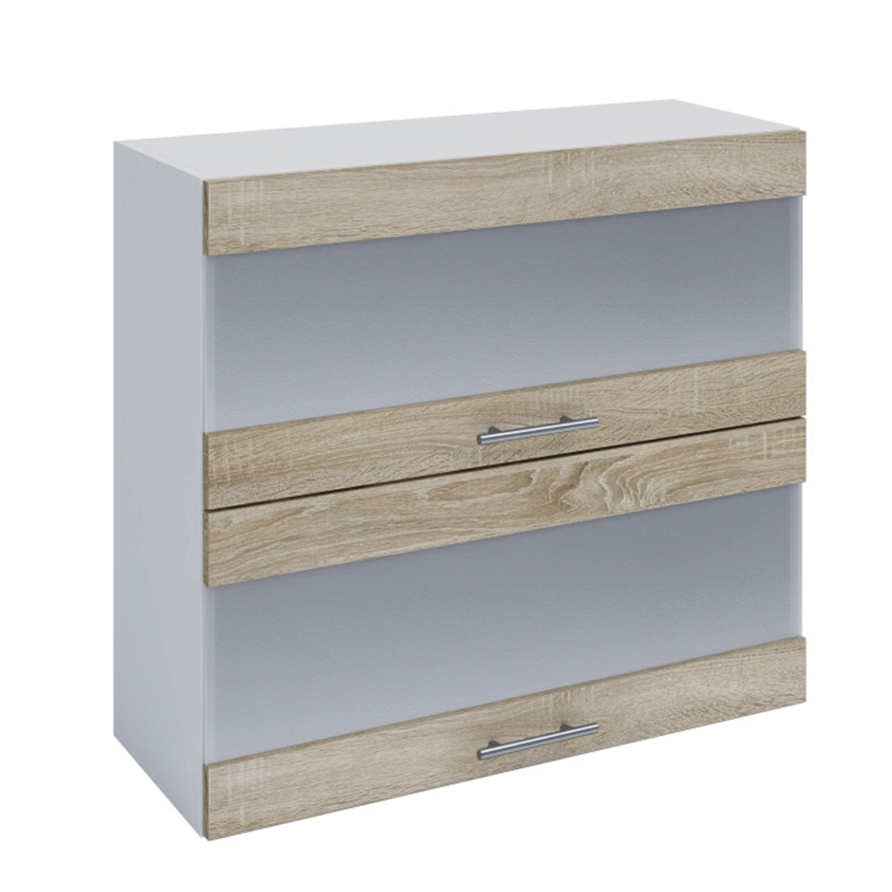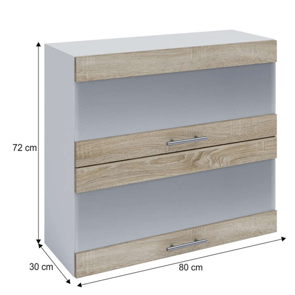 Horná skrinka FABIANA Materiálové prevedenie: DTD laminovaná drevotrieskaFarebné prevedenie: dub sonoma/bielaRozmery (ŠxHxV): 80x30x72 cmHrúbka materiálu: 16 mm Dodávané v demonte.Skrinky základnej zostavy sú dodávané vrátane pracovnej dosky, drezová skrinka je dodávaná bez pracovnej dosky. Sektorové skrinky sú dodávané bez pracovnej dosky.Cena pracovnej dosky je: 1bm: 49 eurMožnosť dokúpenia univerzálneho Ľ/P drezu LAY ON.