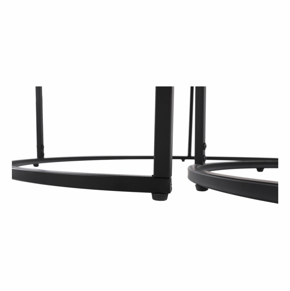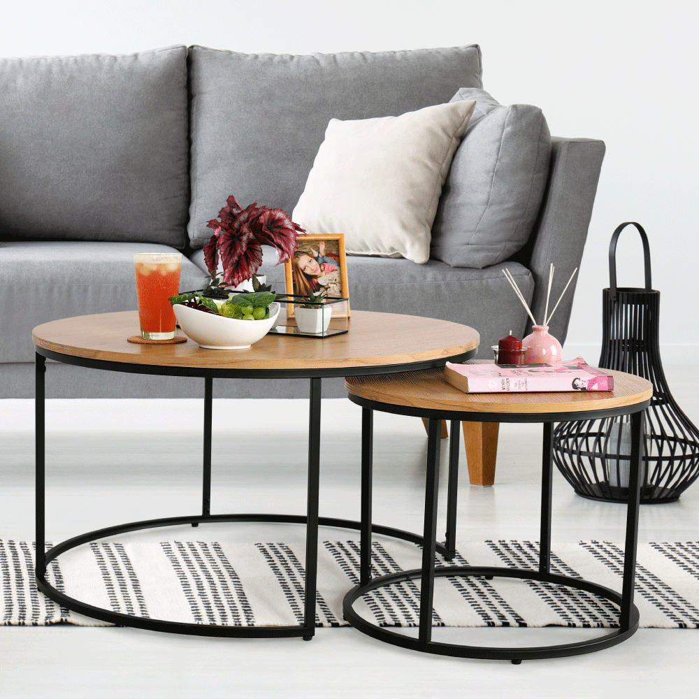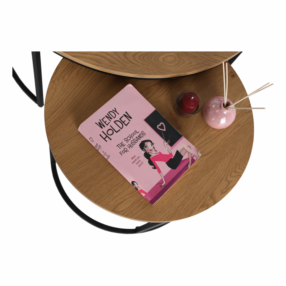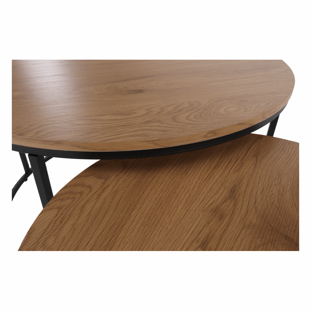 Set dvoch konferenčných stolíkov IKLINMateriál: MDF/kovFarebné prevedenie: dub/čierna Rozmery väčší (priemer x V): 80x45 cmRozmery menší (priemer x V): 50x40 cmNosnosť: 30 kg Dodávané v demonte.