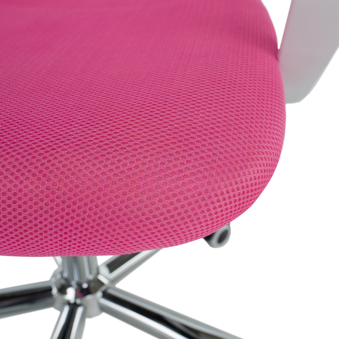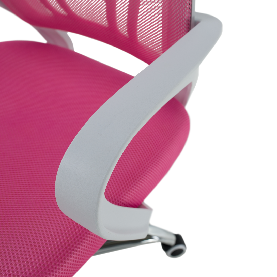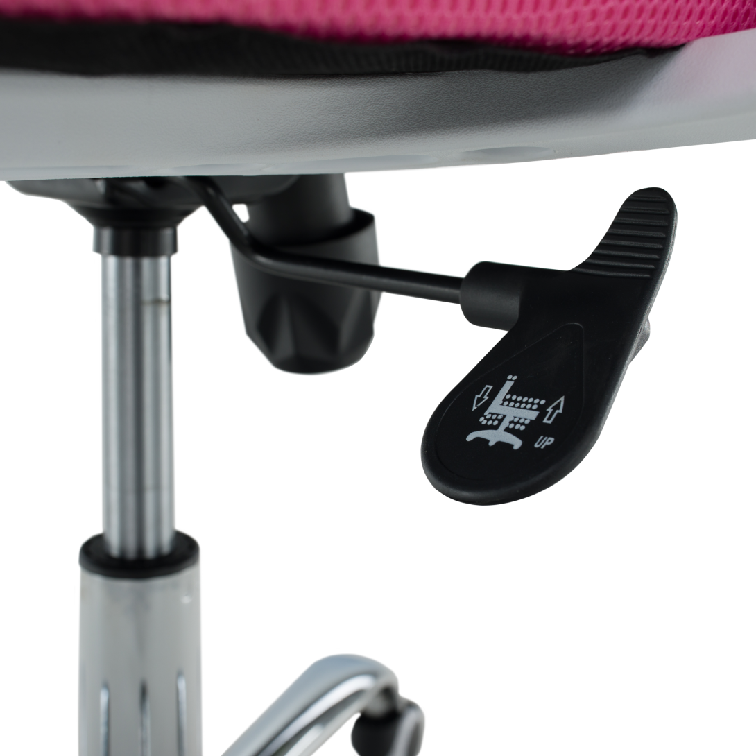 Materiál: látka/plast/kovOderuodolnosť textílie podľa testu Martindale: 90 000 oderovFarba: ružová/biela/chrómovanáRozmery (ŠxHxV): 60x50x91-103 cmNastaviteľná výška sedu : 49-60 cmHĺbka sedu : 50 cmŠírka sedu : 48 cmVýška chrbtovej opierky: 45 cmŠírka chrbtovej opierky: 43 cmNosnosť: 100 kgUniverzálne kolieskaVhodné na mäkké aj tvrdé podlahyMechanizmus hojdaniaPlastová päťcípa ružicaPlastové opierky na rukyPlastová bedrová podperaDodávané v demonte