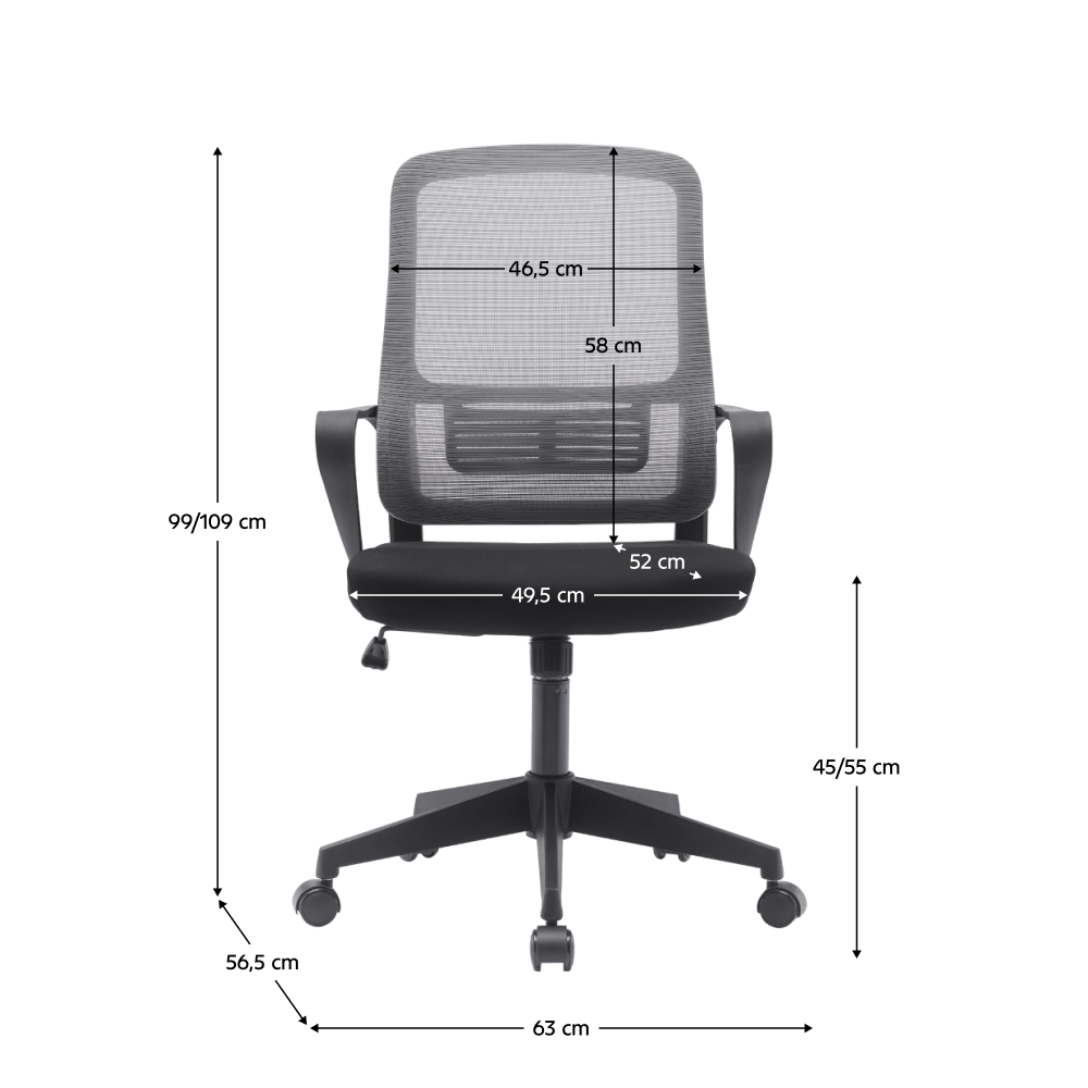 Materiál: sieťovina/látka/plastOderuodolnosť sieťoviny podľa testu Martindale: 90 000 oderovOderuodolnosť látky podľa testu Martindale: 85 000 oderovFarba: sivá/čiernaRozmery (ŠxHxV): 63x56,5x99-109 cmVýška sedu: 45-55 cmHĺbka sedu: 52 cmŠírka sedu: 49,5 cmVýška chrbtovej opierky: 58 cmŠírka chrbtovej opierky: 46,5cmNosnosť: 100 kgMožnosť nastaviť výšku seduPäťramenná plastová podstavaUniverzálne kolieskaVhodné na tvrdé aj mäkké podlahyMechanizmus hojdaniaDodávané v demonte