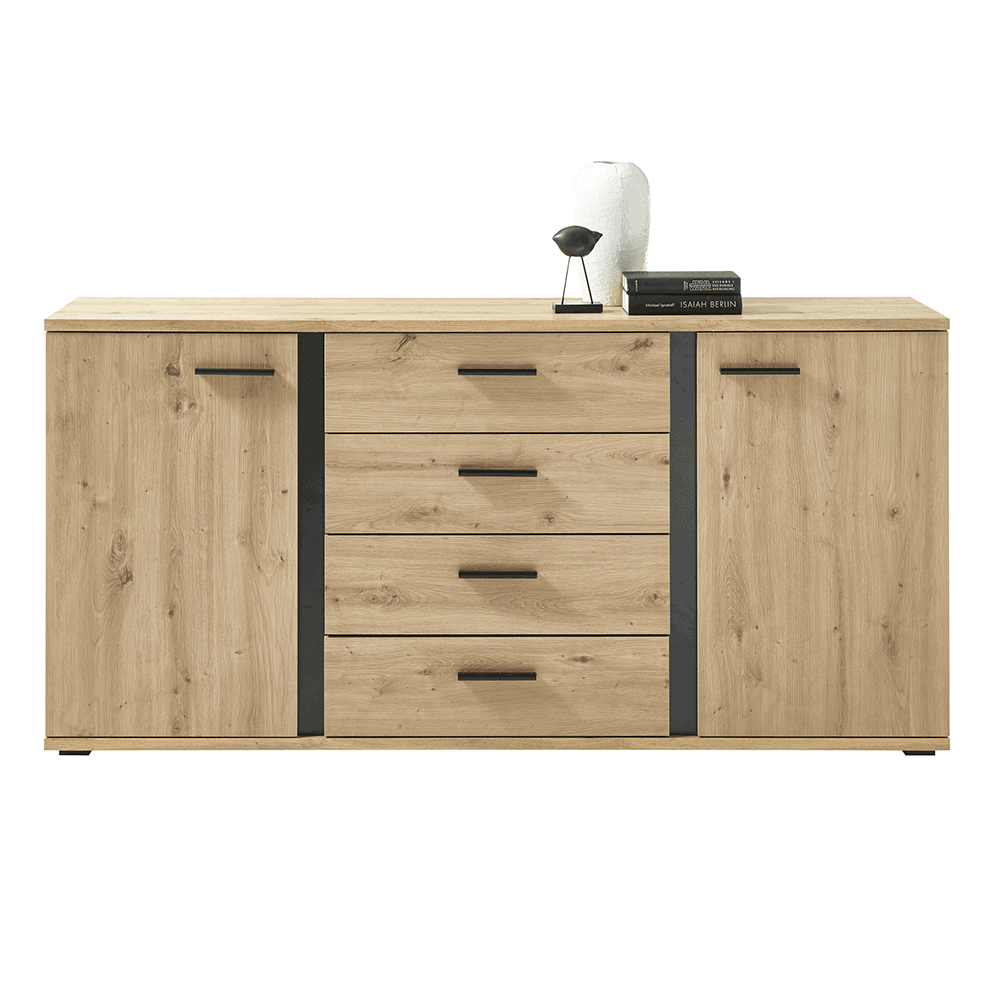 Komoda KANODEMateriál: laminovaná drevotrieskaFarba: dub artisan/čiernaRozmery (ŠxHxV): 170x40x84 cmHrúbka materiálu: 16 mmObsahuje dve skrinky a štyri zásuvkyS úchytkamiDostatok úložného a odkladacieho miestaRustikálny štýlDodávané v demonte