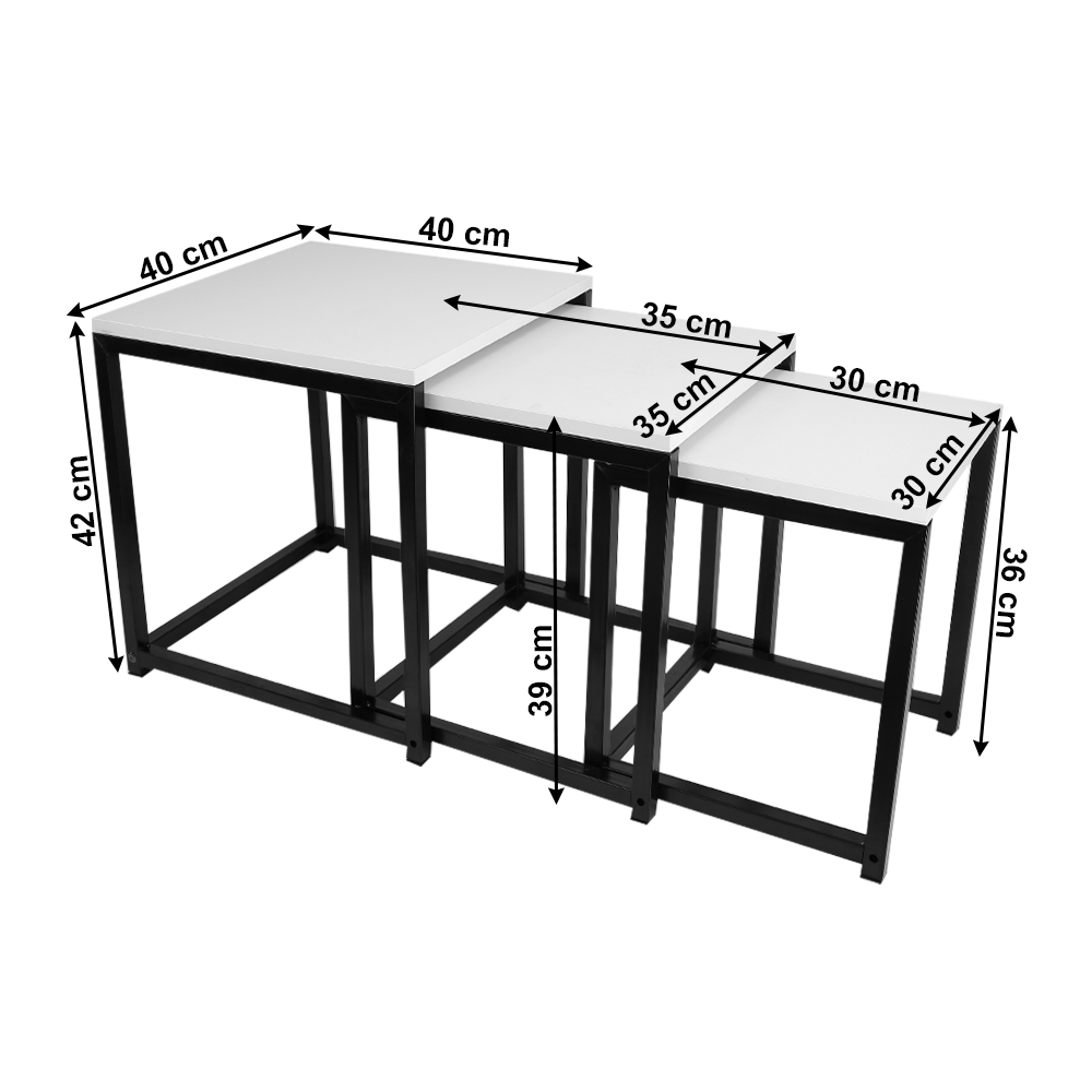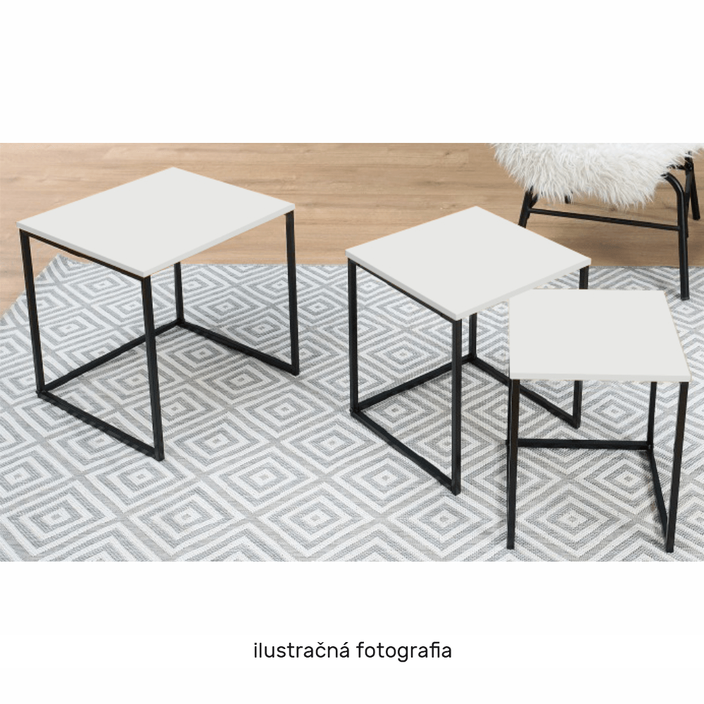 Set 3 konferenčných stolíkov, KASTLER NEW TYP 3Materiál: MDF/kovFarba: biela matná/ čiernaRozmery väčší stolík (ŠxHxV): 40x40x42 cmRozmery stredný stolík (ŠxHxV): 35x35x39 cmRozmery menší stolík (ŠxHxV): 30x30x36 cmHrúbka materiálu: 15 mm Dodávané v demonte.