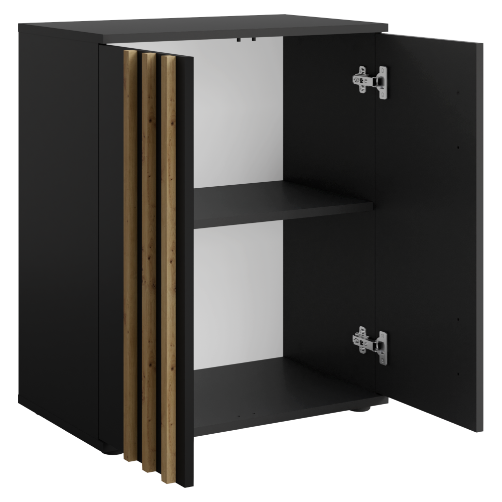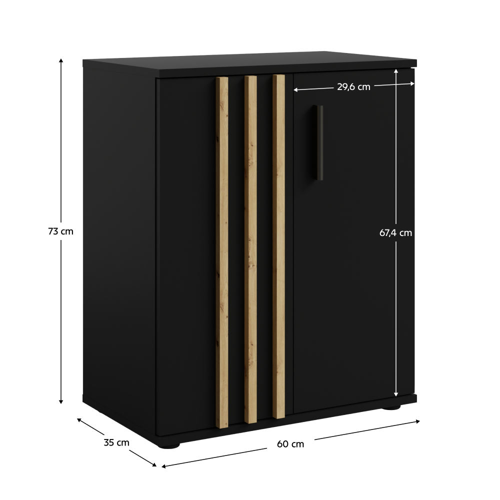 Materiál: DTD laminovaná/MDFFarba: čierna/dub artisanRozmery (ŠxHxV): 60x35x73 cmHrúbka materiálu: 1,6 cmHrúbka lamely: 1,6 cmŠírka lamely: 1,8 cmDvojdverováS policouNosnosť police: 5 kgNosnosť odkladacej plochy: 10 kgÚchytka len na jednej strane dveríMateriál úchytky: MDFFarba úchytky: čiernaDodávané s ozdobnými lamelamiModerný štýlDodávané v demonte