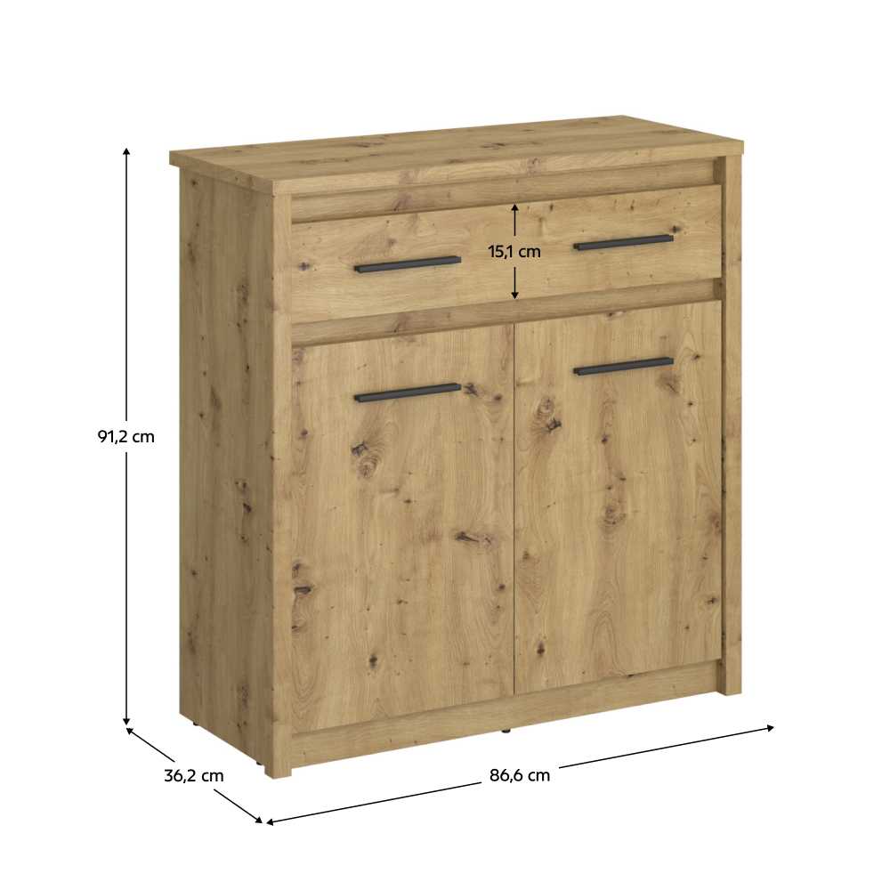 Materiál: DTD laminovaná/ABS hranyFarba: dub artisanRozmery (ŠxHxV): 86,6x36,2x91,2 cmHrúbka materiálu: 1,6-3,2 cmPlastové úchytkyFarba úchytiek: čiernaŠuplíkVýška šuplíka: 15,1 cmPolicaNosnosť police: 5 kgDvojdverová skrinkaPlastové nožičkyModerný dizajnOdporúčame pripevniť k steneDodávané v demonte