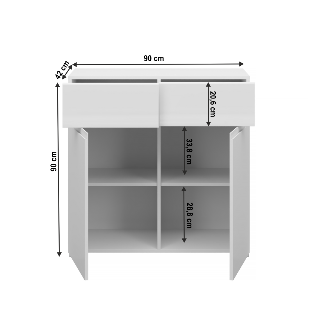 Materiál korpus: DTD laminovanáFarba: bielaMateriál dvierka: MDFFarba: biely extra vysoký lesk HGRozmery (ŠxHxV): 90x42x90 cmHrúbka materiálu korpus: 1,6 cmHrúbka materiálu dvierka: 1,8 cmMnožstvo úložného priestoruDva šuplíkyDvojdverováModerný štýlDodávané v demonte