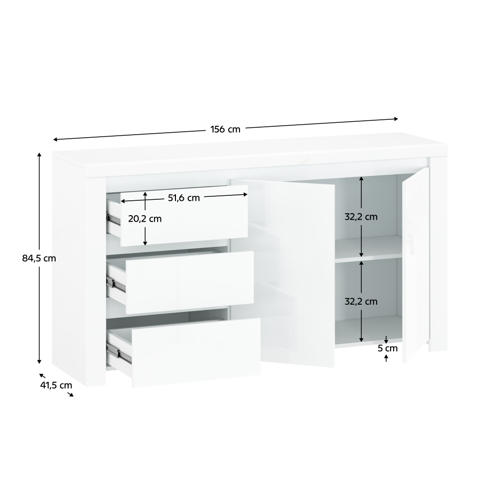 Materiál: laminovaná DTD/MDFFarba: biely leskRozmery (ŠxHxV): 156x41,5x84,5Materiál dvierka: MDFHrúbka materiálu: 1,6 cmABS hranyObsahuje tri zásuvky a dvojdverovú skrinkuBez úchytiekModerný dizajn a atraktívny dizajnDodávané v demonte