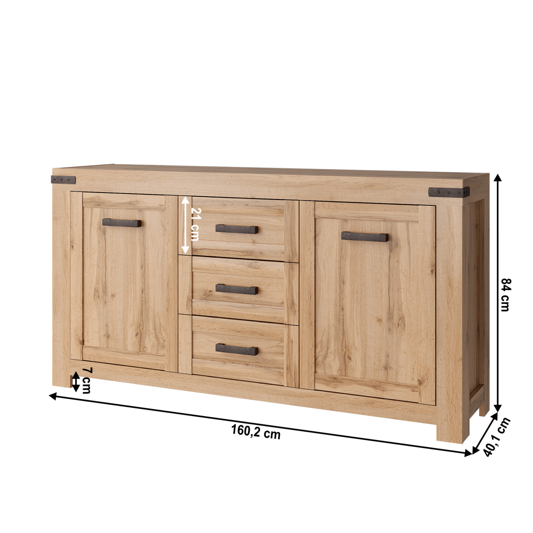 Materiál: DTD laminovaná/MDF/plastFarba: dub wotanRozmery (ŠxHxV): 160,2x40,1x84 cmVýška nožičiek 7 cm Hrúbka materiálu: 1,6 - 2,2 cm DvojdverováDve skrinkaV skrinkách sú policeTri šuplíkyVýška šuplíkov: 21 cmPlastový dekór a úchytkyMDF dvierka Dodávaná v demonte